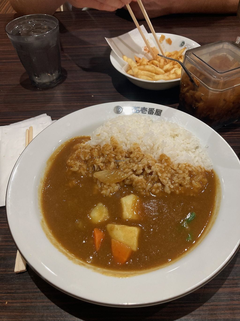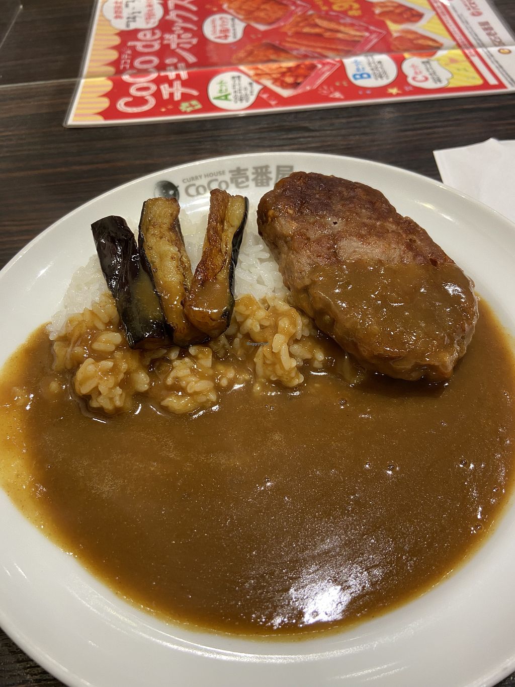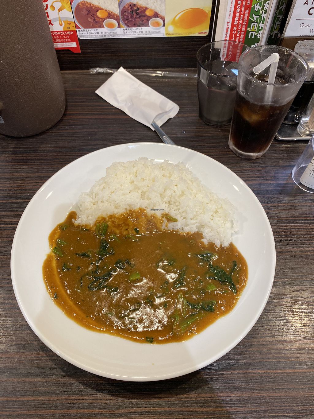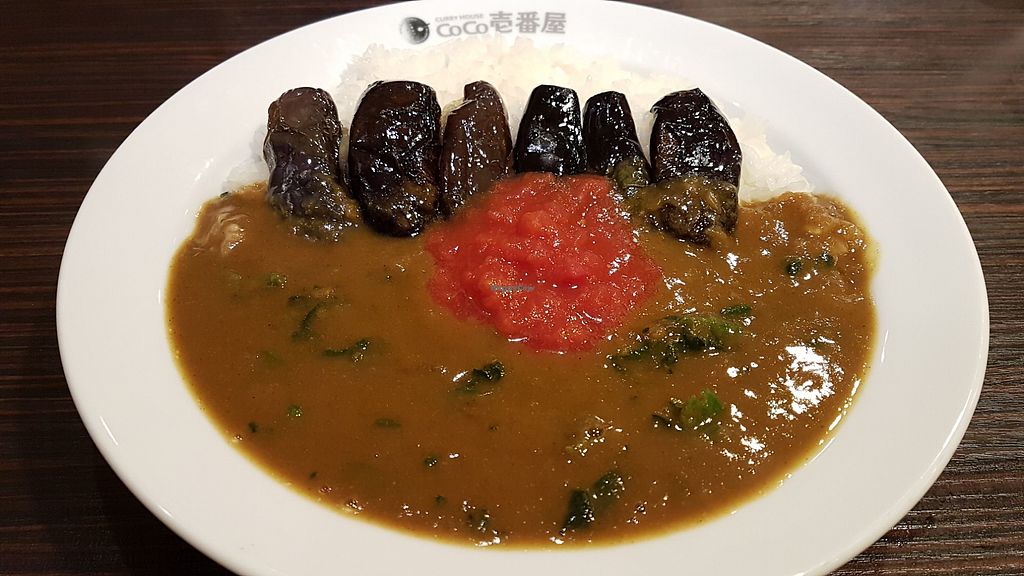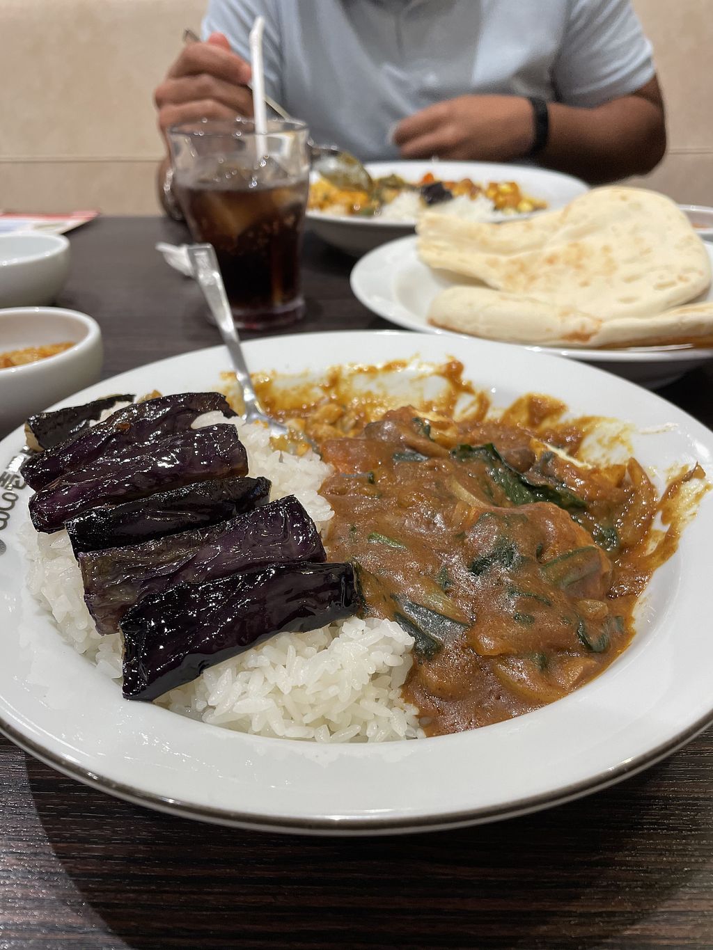 Vegetarian curry (it's vegan) with eggplant, spinach and tomato