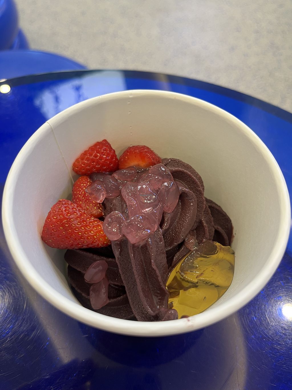 Variety of soft serve flavours. When i visited the two vegan flavours were açai and mango. Lots of toppings to choose from.