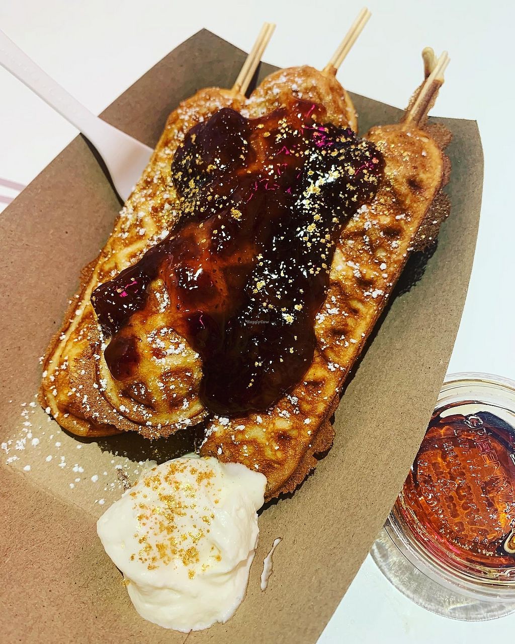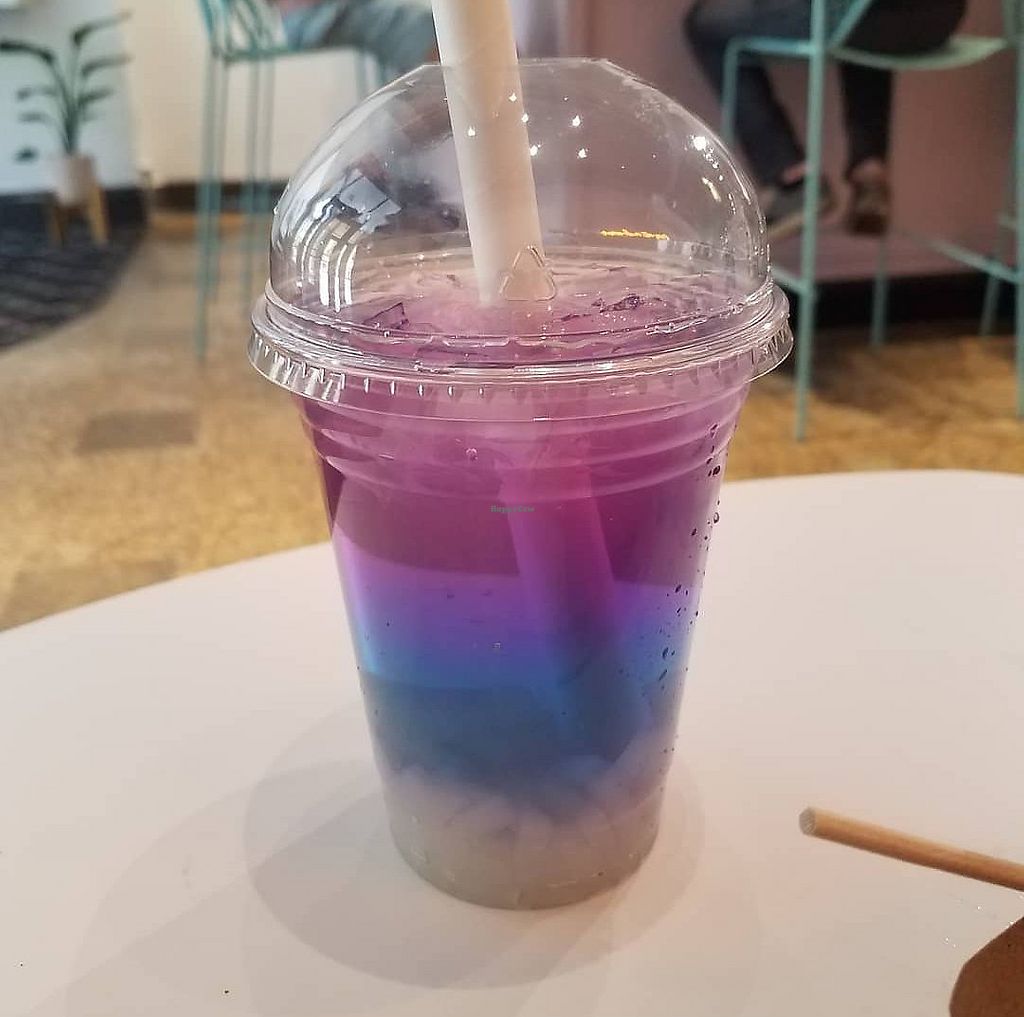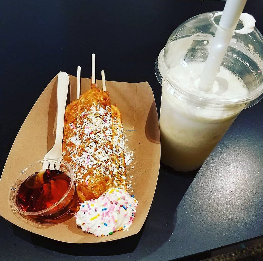 Waffles with straw and cream SO YUM and iced sweetened butterfly pea f…