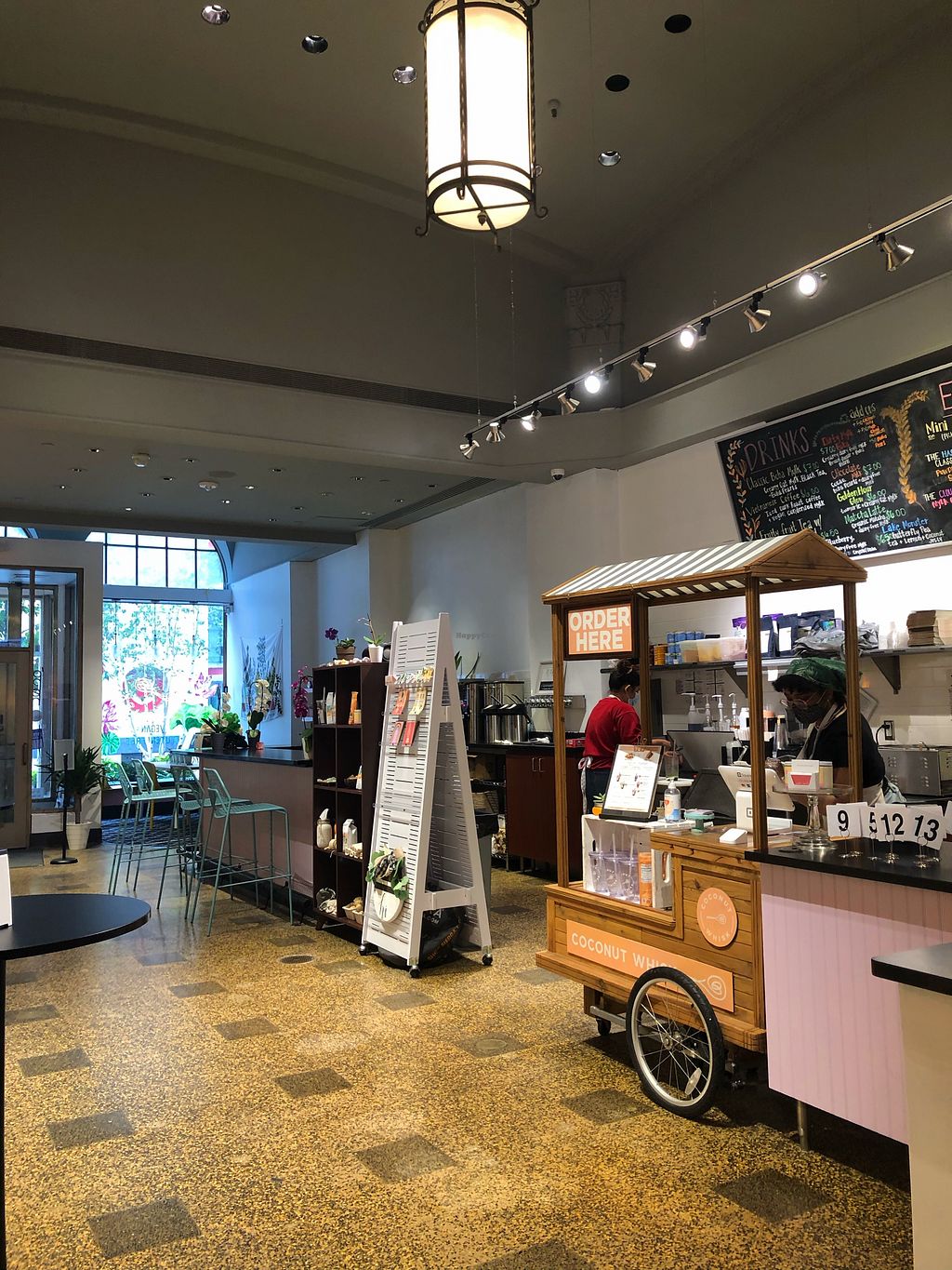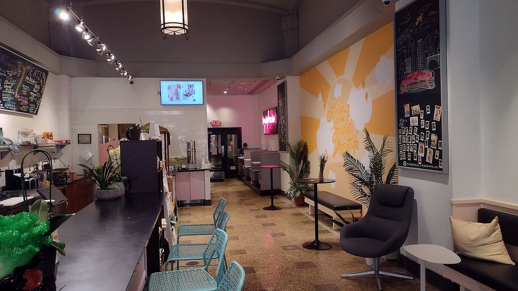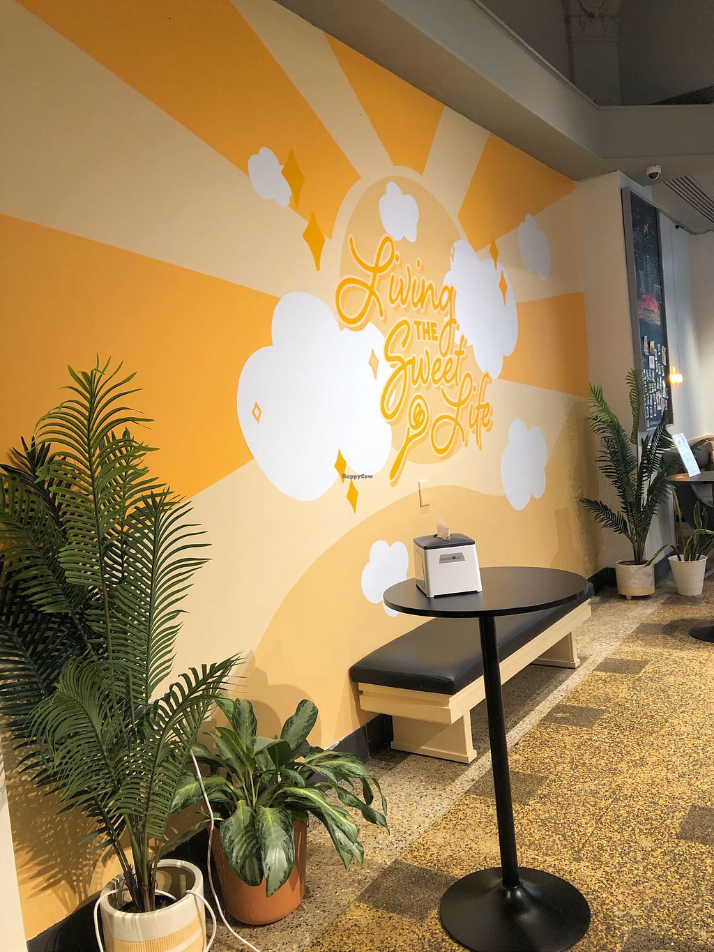 Booths in the back, high tables, bar & cushioned bench
