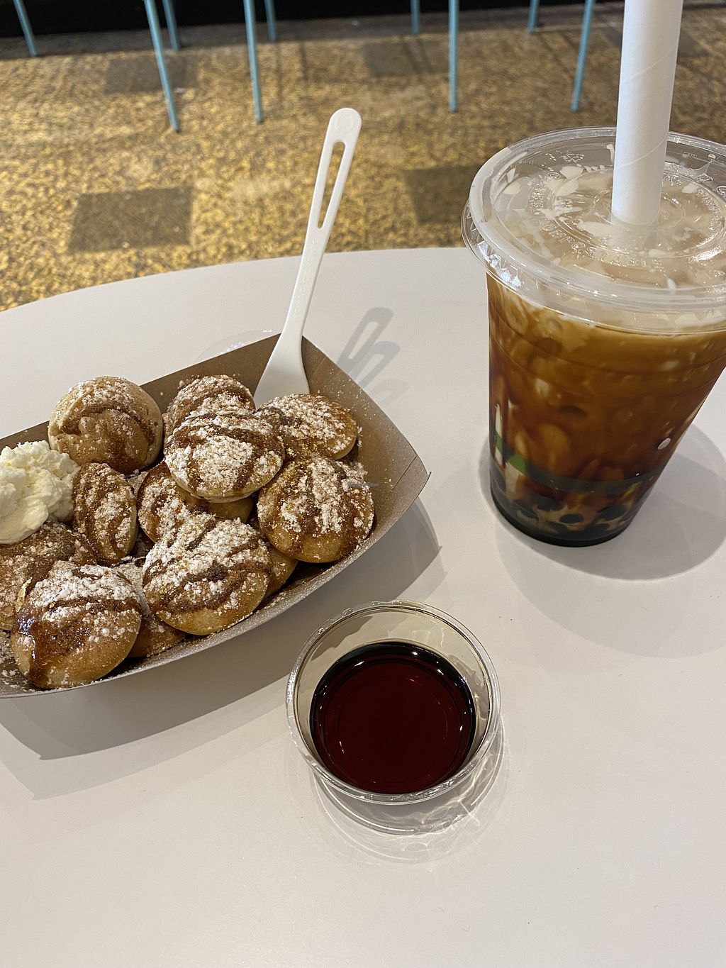 Creme brulee boba and Mom's favorite cereal mini pancakes