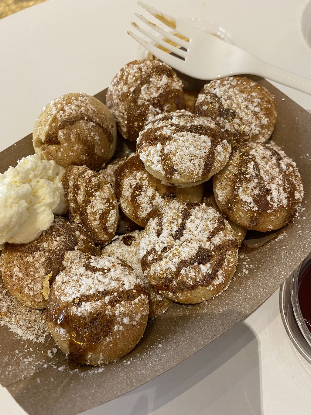 Classic mini pancakes with powdered sugar and gold dust