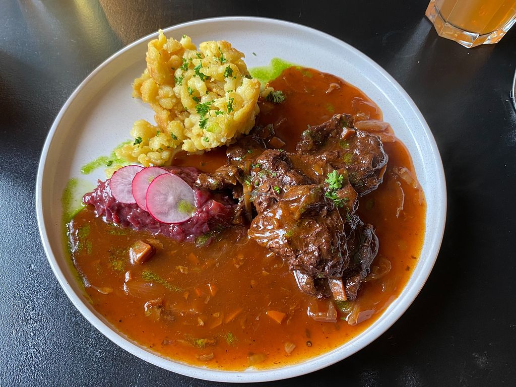 Civet de soja Sauce au vin chaud et spätzli, chutnex pomme et chou ro…
