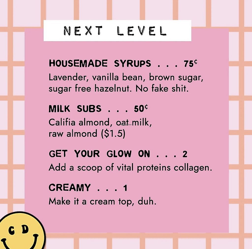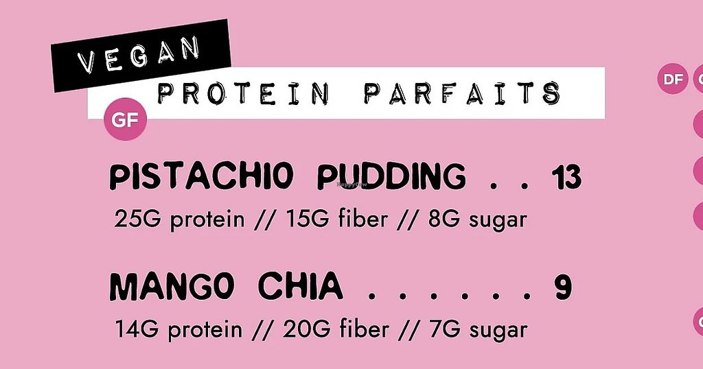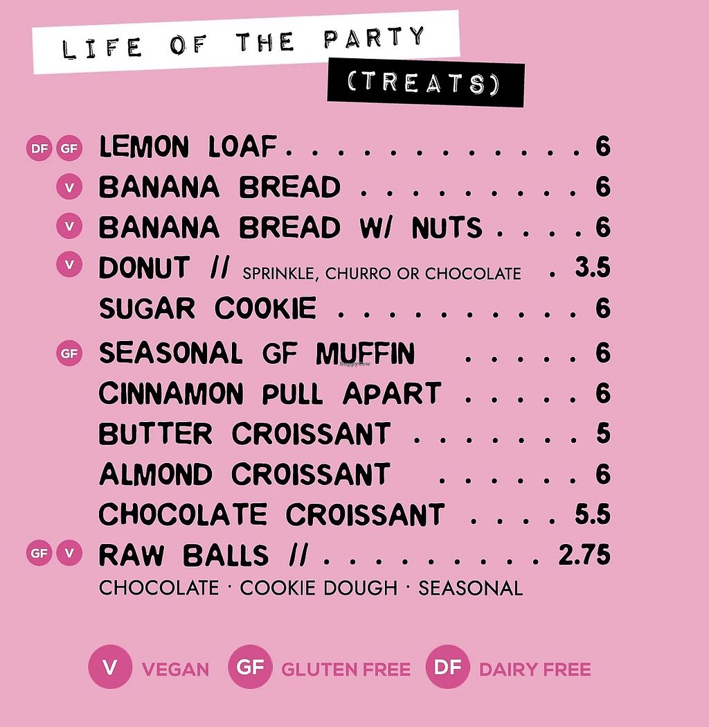 Coffee shop offering several vegan options, including pistachio pudding protein parfait, mango chia protein parfait, banana bread with or without nuts, vegan donuts in flavors like sprinkle, churro, and chocolate, as well as raw balls in chocolate, cookie dough, or seasonal varieties. Provides almond milk and oat milk for coffee. Open Mon 8:00am-2:00pm, Tue-Sun 7:00am-4:00pm.