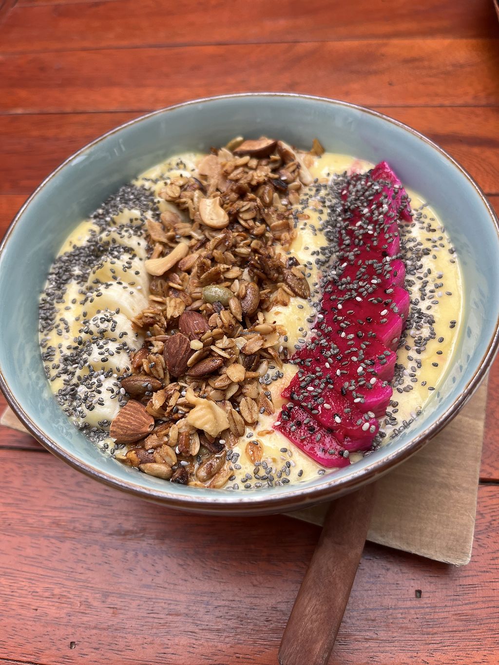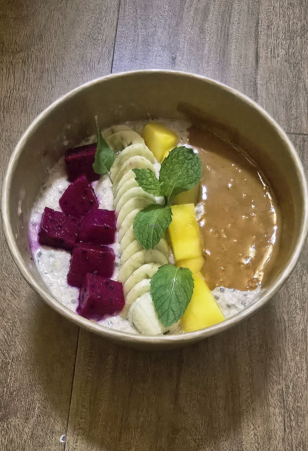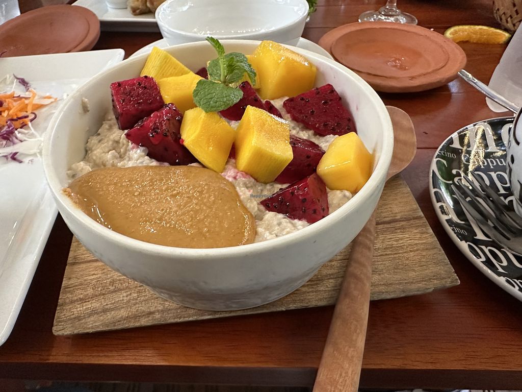 Overnight oats with peanut butter, mango, dragon fruit, and banana at …