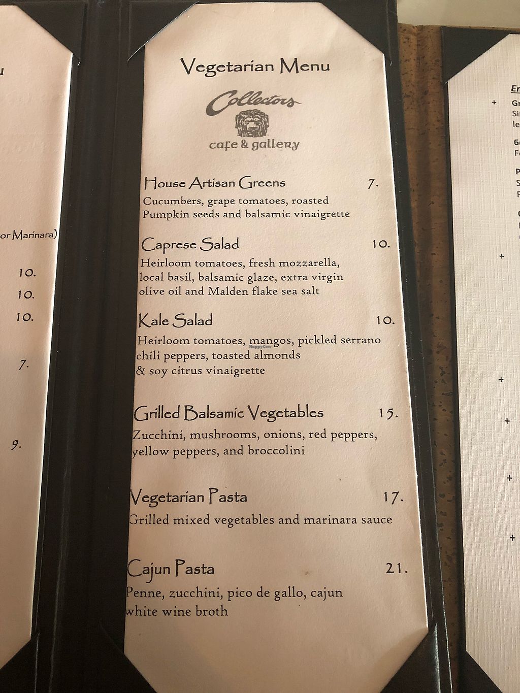 While the vegetarian/vegan options are not extensive, this gem of a place is a great dining experience. An eclectic variety of rooms, all with walls and ceilings covered in art. Upscale & great service. We had a lunch of salads and black bean cakes. A few pastas available. Lunch was quiet. Apparently it's busy evenings and reservations are suggested.