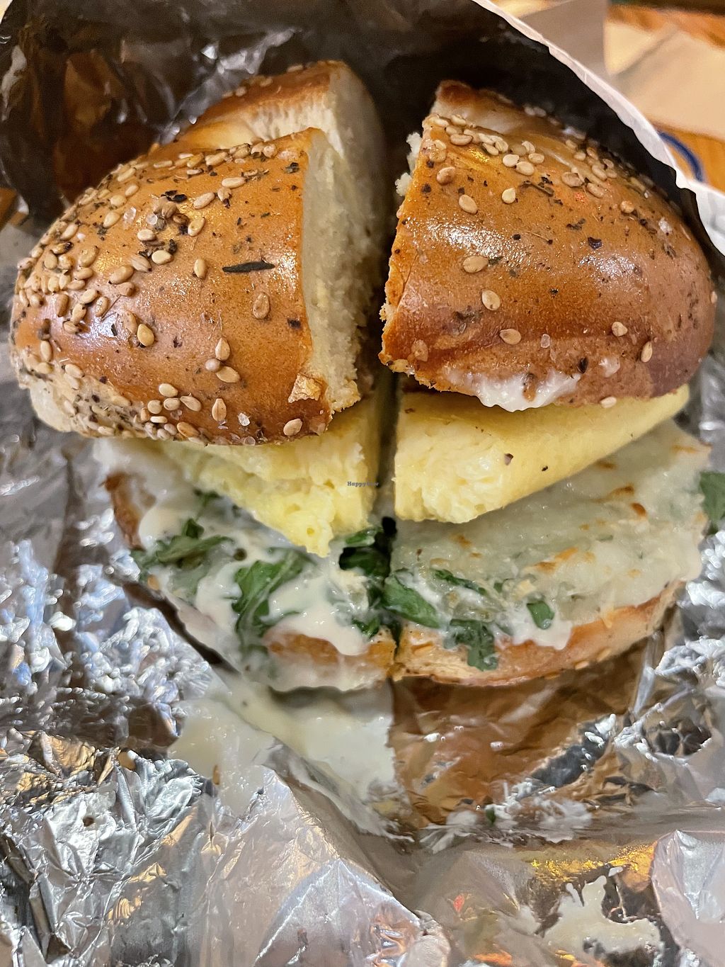 Got the vegan egg bagel with sausage, mozzarella, aioli and hash browns on a rosemary bagel. Delicious