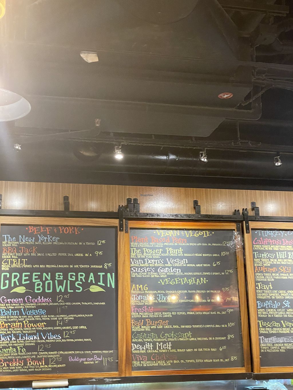 Serves meat, vegan options available. Cafe with vegan choices. Menu includes vegan Just egg and Beyond sausage breakfast bagel sandwich, sesame kale grain bowl, avocado toast, lemon teriyaki seitan sandwich, hummus vegetable sandwich, bagels with vegan cream cheese and more. Plant-based milk alternatives available. One of three locations. Open Mon-Sun 7:00am-7:00pm.