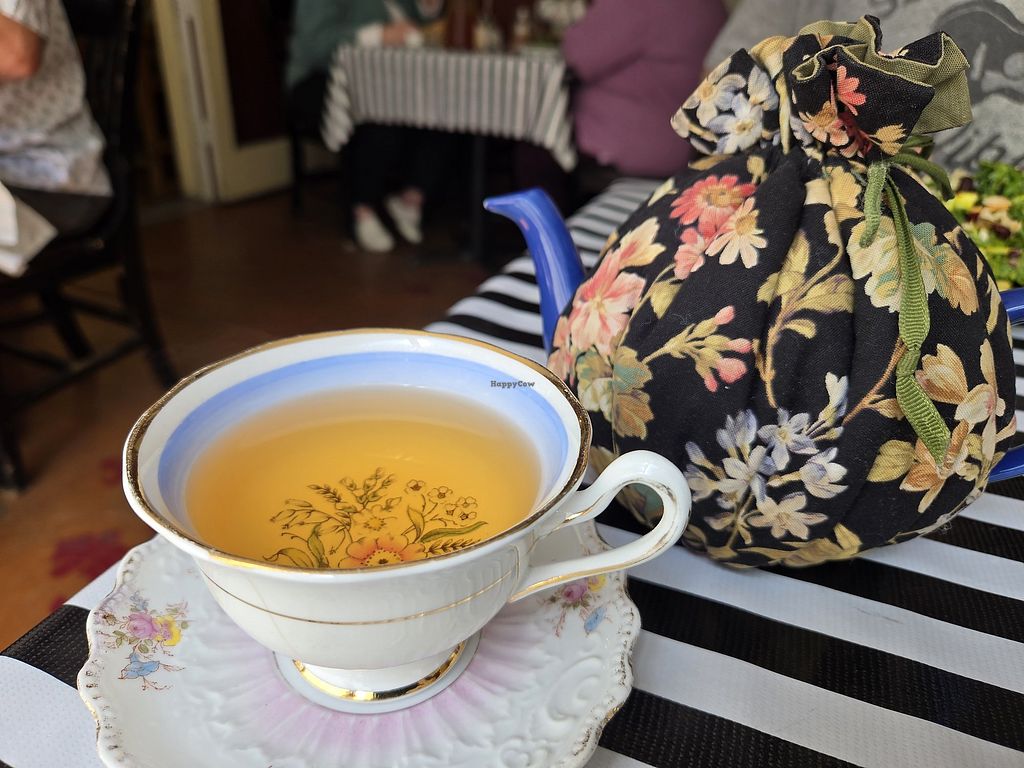 My husband and I had a lovely lunch here today. We are visiting from out of town. The people who work in this teahouse were so nice. Although there are limited vegan options, we did find a couple of delicious items. We had the Hildreth veggie sandwich minus the cream cheese on their homemade wheat bread. The sandwich was delicious. The bread was so fresh. The sandwich came with a side of fruit. We also shared the kale salad with a turmeric dressing, which was also delicious. There were so many tea choices it was hard to decide. We each picked a different flavor, and we were brought our own little tea pot with a tea cozy. They have teacups and saucers on the tables. You can choose your own. We really enjoyed our lunch here. The teahouse is very quaint. We left very satisfied. Give this teahouse a try.