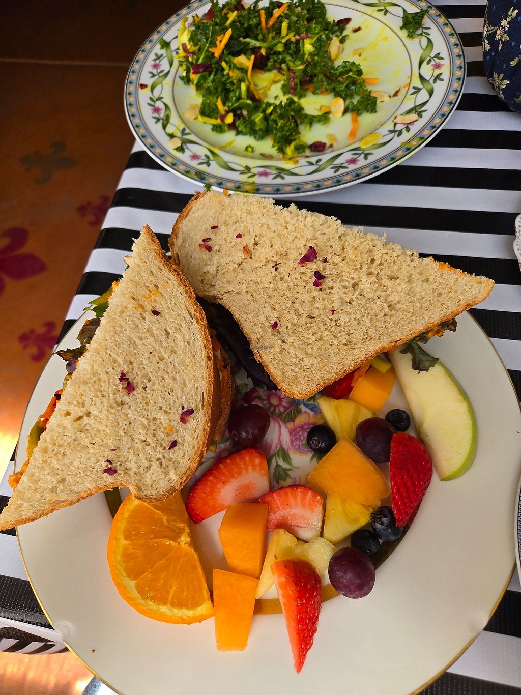 They have a few good options for vegans. Their fresh wheat bread made in their bakery is vegan, making it easy to veganize sandwiches. They offer a peanut butter and jelly sandwich, and also a tasty veggie sandwich called “The Hildreth”, just ask for no cream cheese on it. They also have numerous salad options, and of course tea options! Sides include delicious fresh fruit, and sometimes a vegan soup of the day. Really not bad for a tiny historic town.