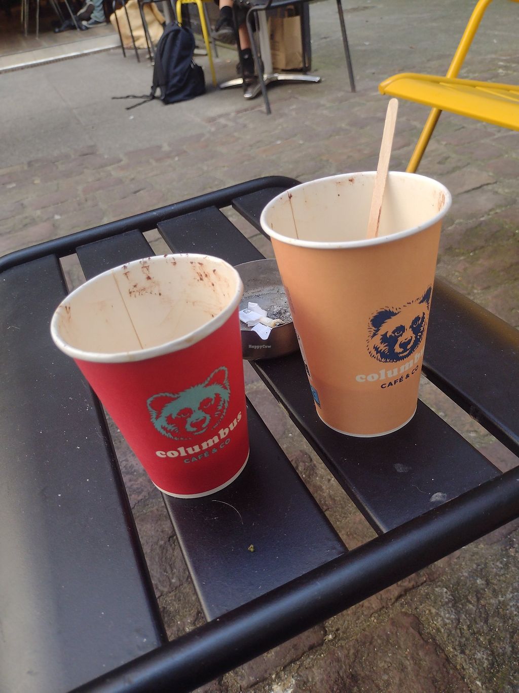 Getränke im Pappbecher. Auswahl zwischen Hafer- Soja und Kokosmilch. 70ct Aufpreis. Schattiger Außenbereich