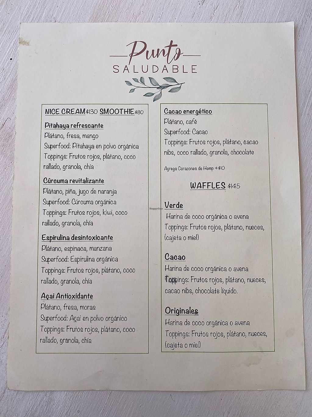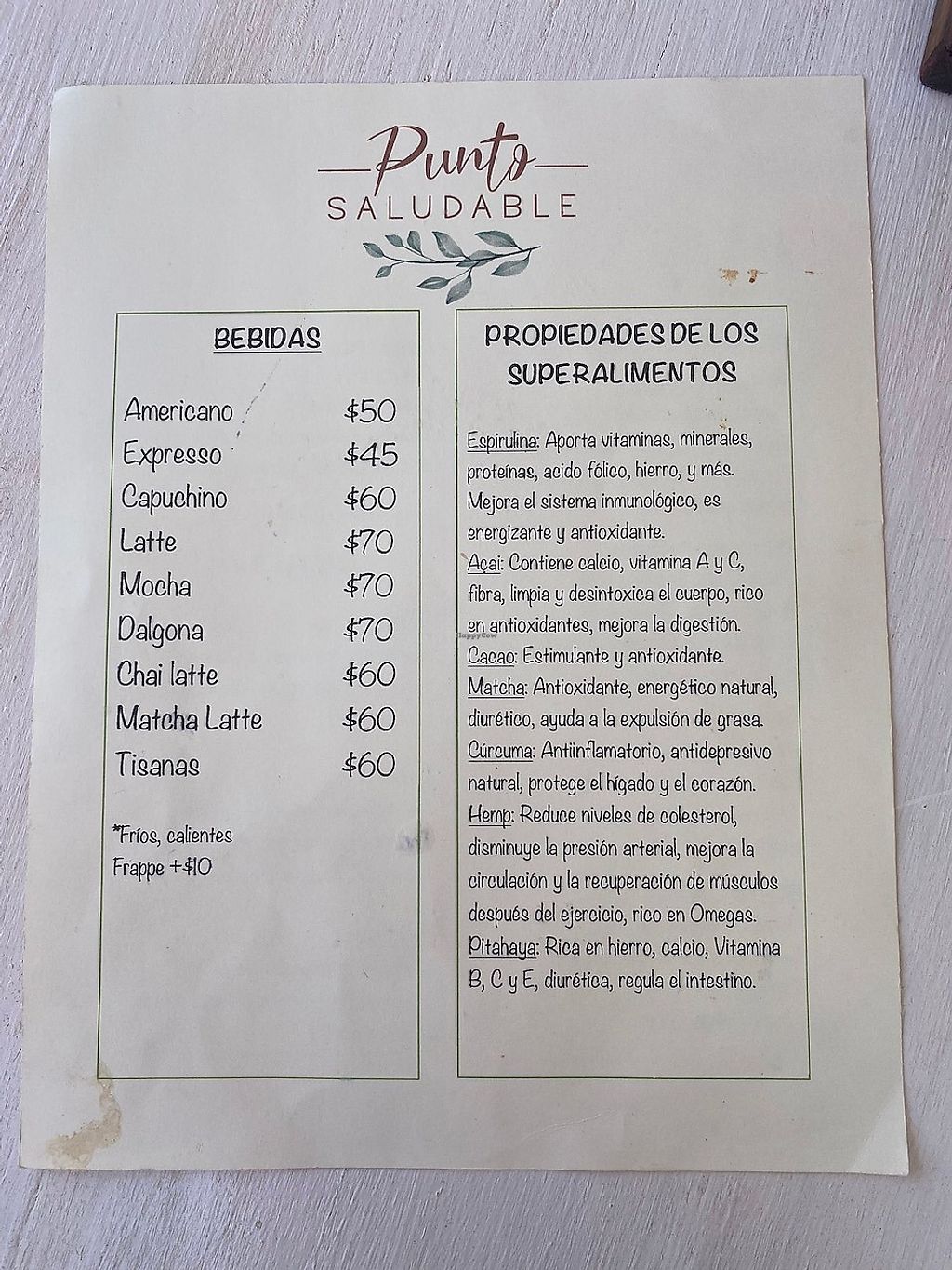 Small health focused cafe serving coffee, tea, acai bowls and a rotating selection of vegan dishes. Sample dishes include waffles, sandwiches, toasts and more. Previously called Punto Saludable. Reported closed May 2024.
