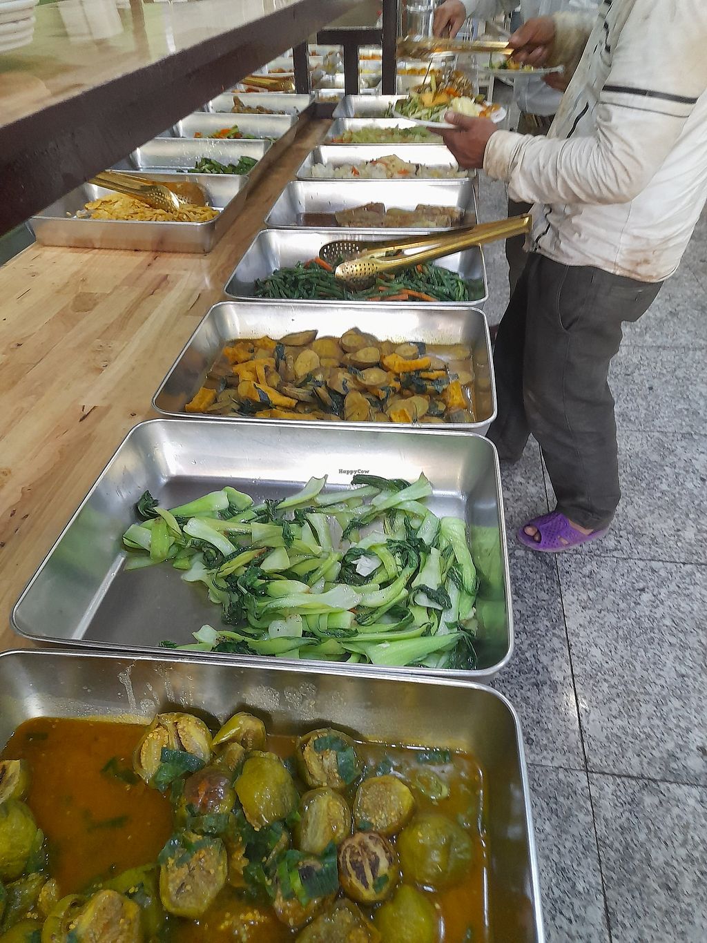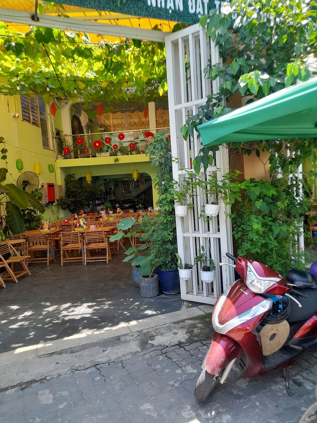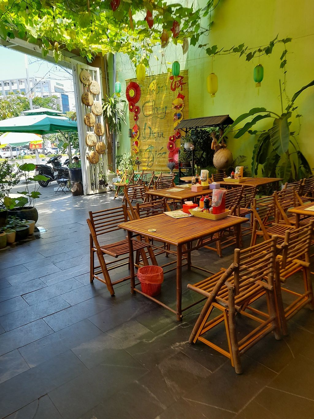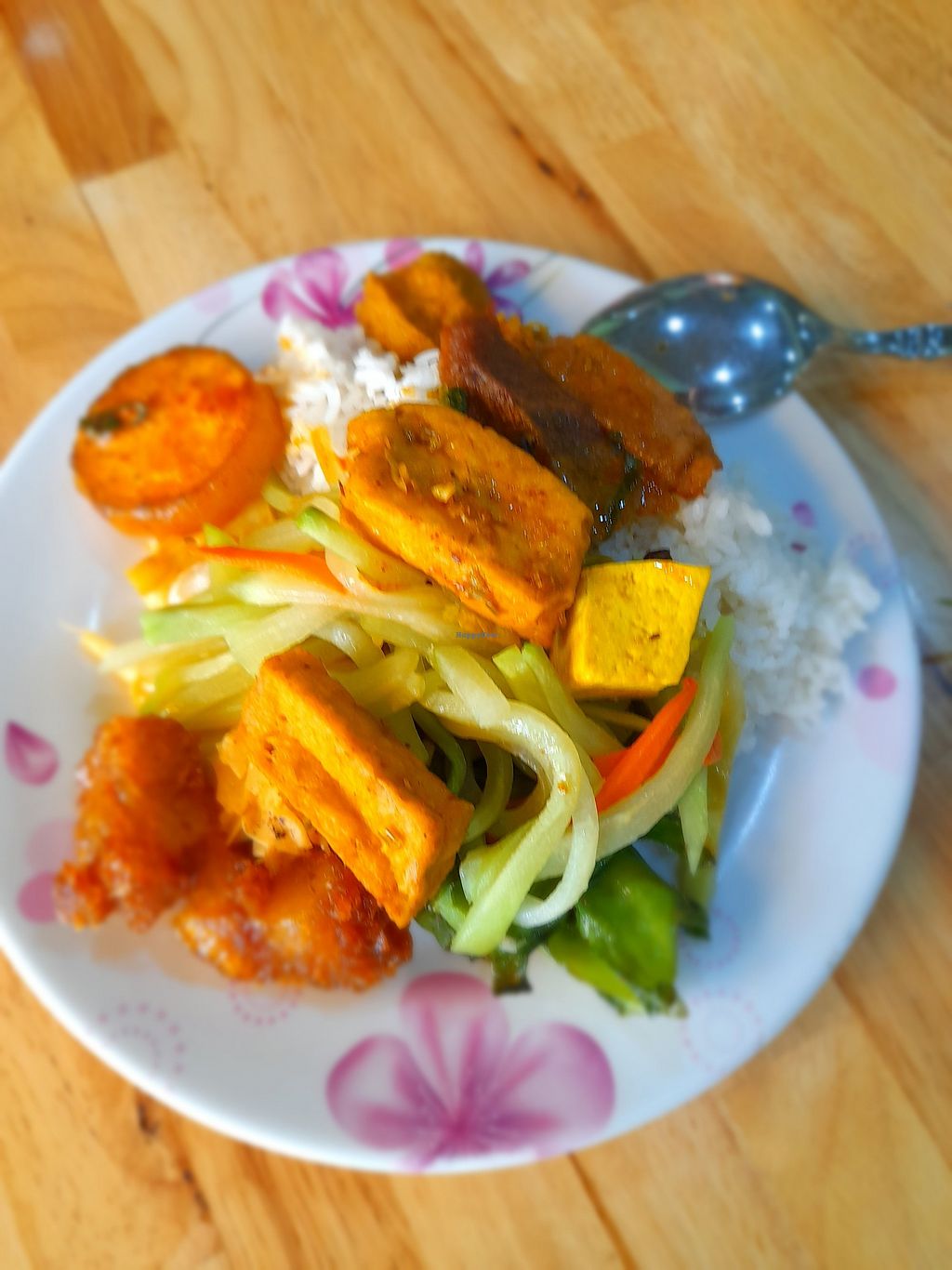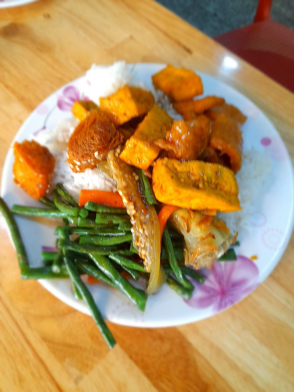 There is always a great selection of tofu and vegetable dishes. No English is spoken but you point to the ones you want. It’s part of the pagoda/orphanage and some of the older ones from the orphanage work in the restaurant. Really friendly and incredibly cheap 30k for com chay which includes soup and iced teas
