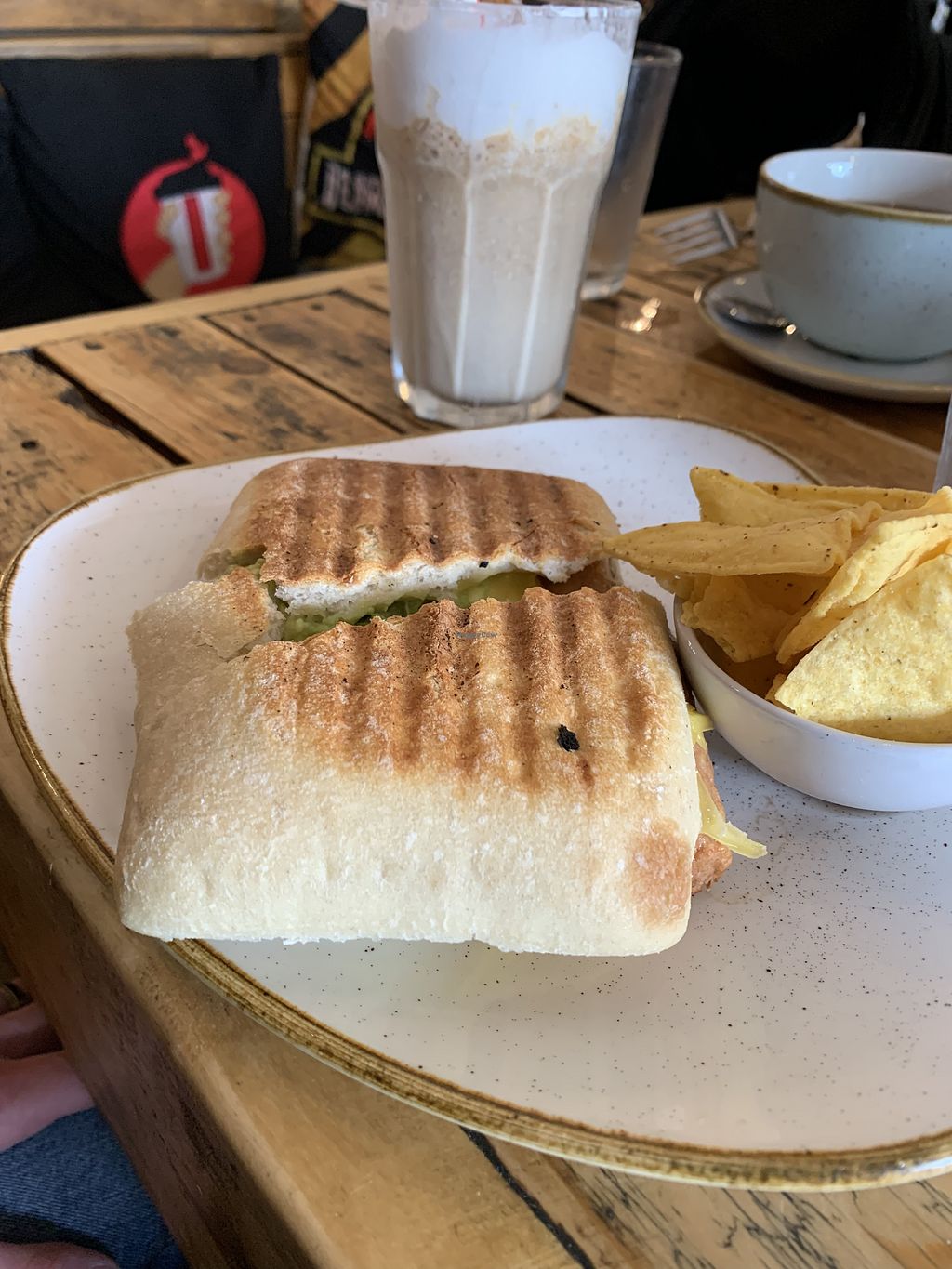 The staff were very friendly, they had non diary mills for coffee and made a delicious pumpkin spice iced latte (in July 😋) Vegan food options include; vegan sausage and cheese panini, vegan cheese and onion chutney panini, “vegan one” waffle (toms, avo, sausage, cheese, balsamic drizzle), hummus and avocado waffle, vegan chocolate waffle. We had the cheese and onion panini and the vegan one waffle. Both were lovely, the waffle reminded me a bit like a Yorkshire pud, only downside is that the waffle could have done with something a bit saucy to go with it.