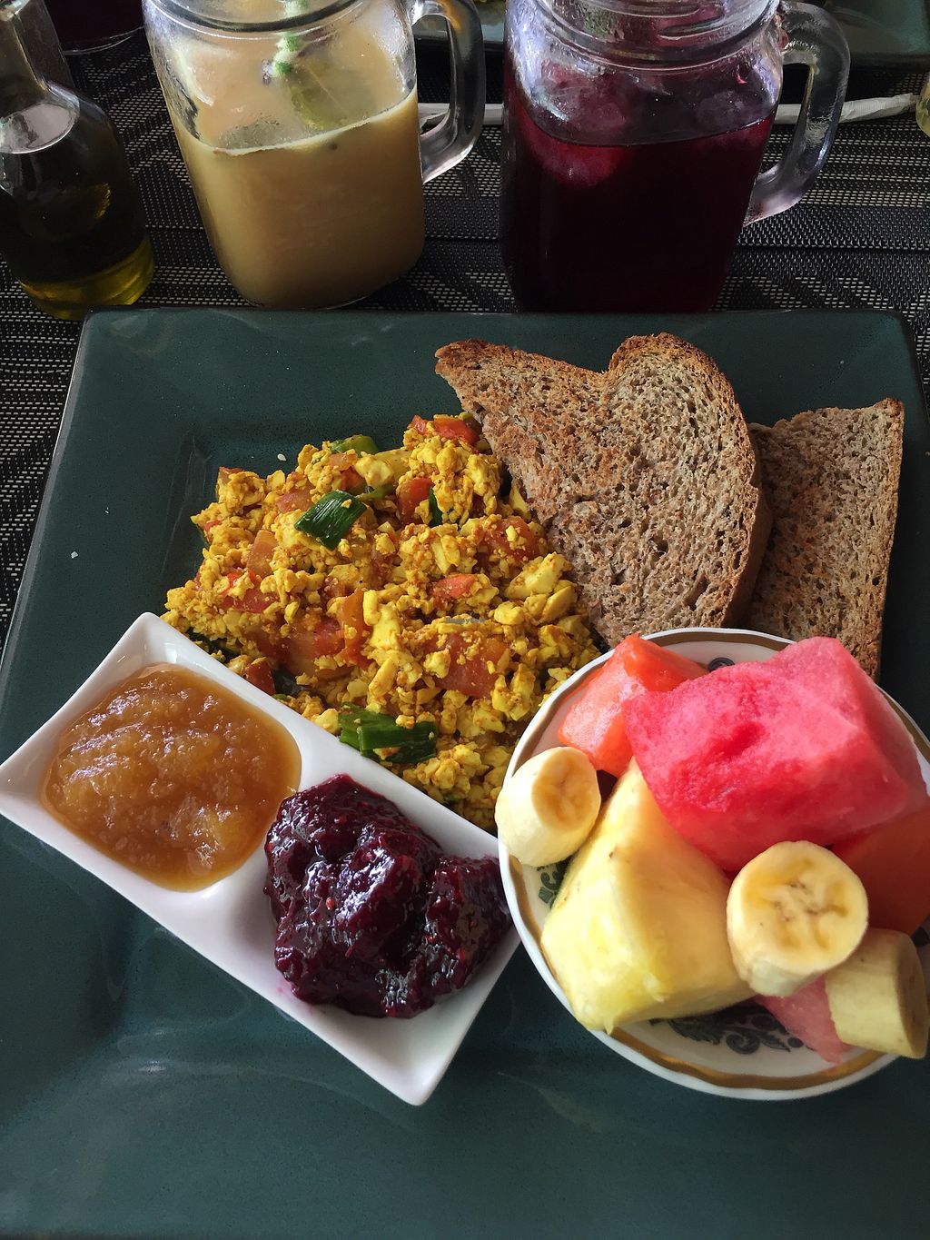 Vegan Breakfast (tofu scramble, tropical fruit, bread with jam) - drin…