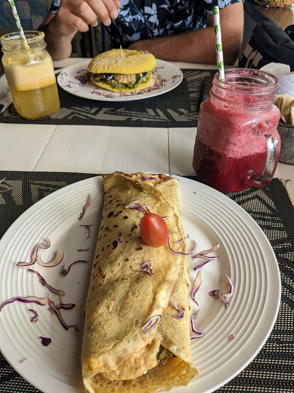 Avocado, mushroom, aubergine, pesto chickpea wrap