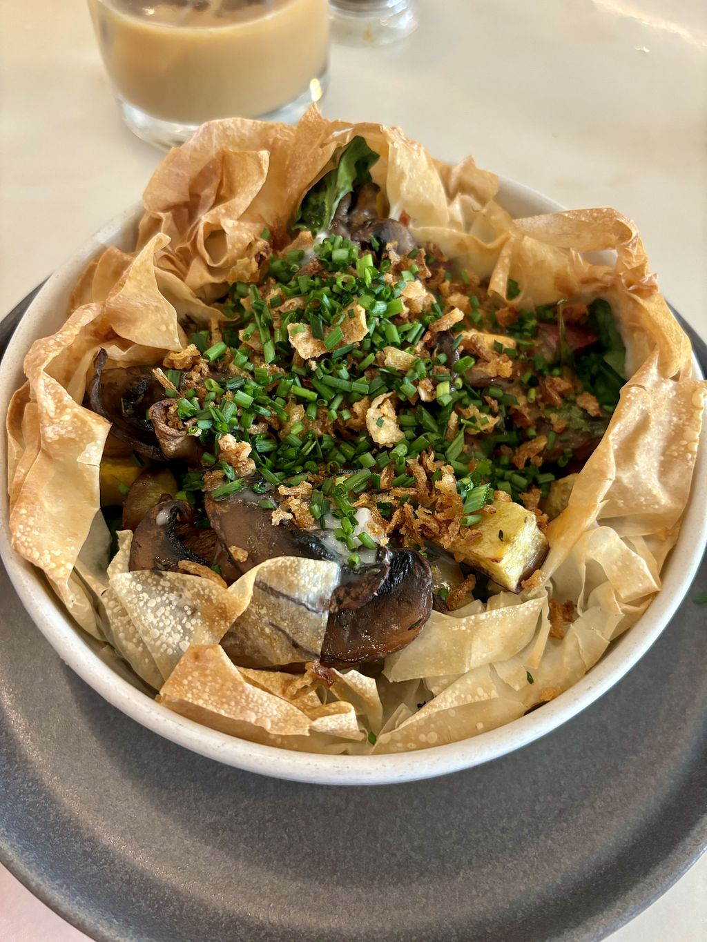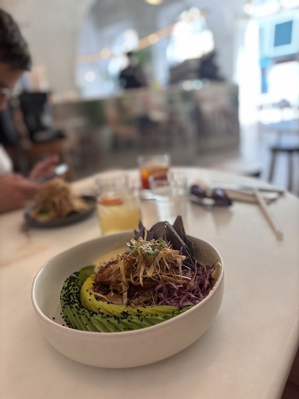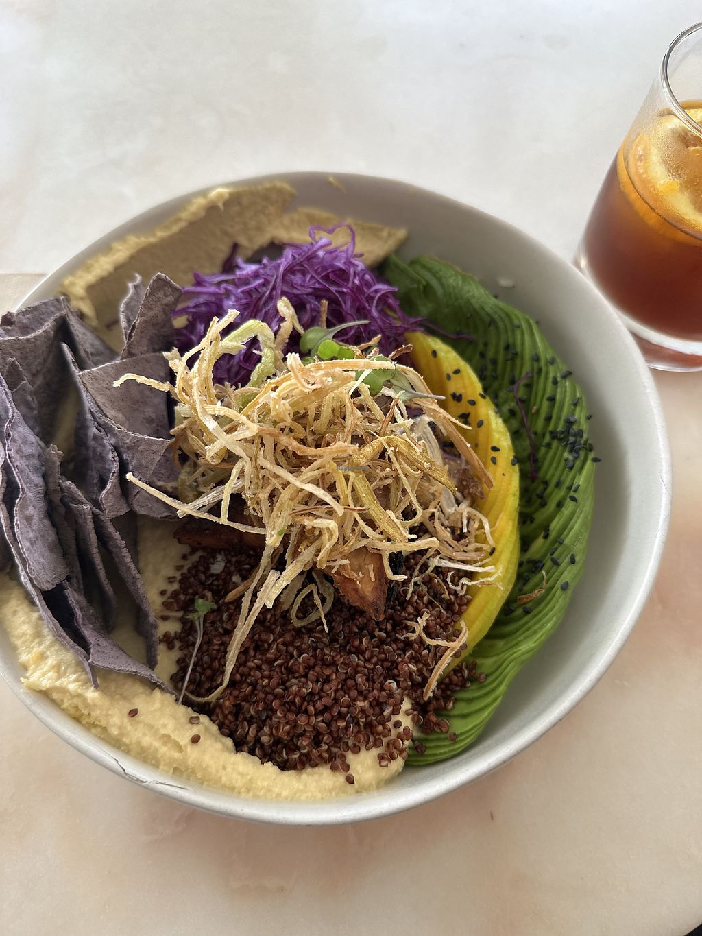 This spot was across from my hotel so after checking in I went over for a late lunch/early dinner on my first night. On that visit I had a green bowl which was a delicious base of hummus topped with quinoa, mangos, avocado, satay tempeh, cabbage and corn chips.