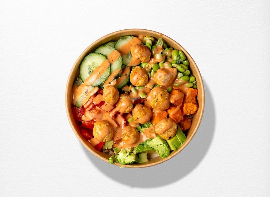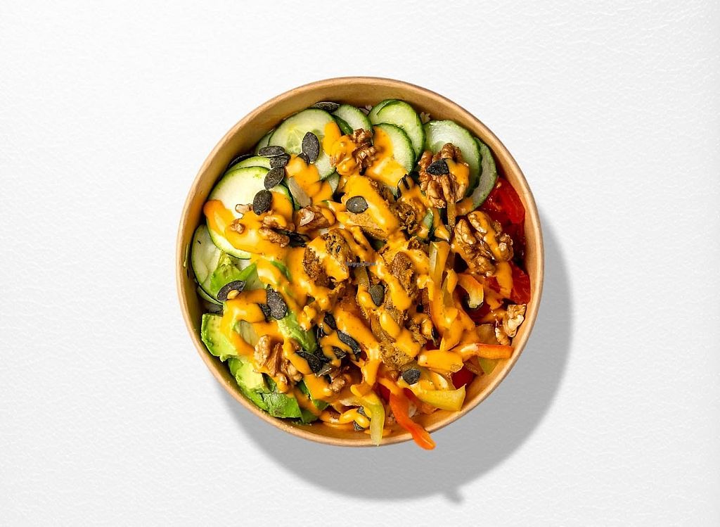 Serves meat, vegan options available. Bowls-centric bistro with labeled vegan options. Offers a vegan signature bowl and also a "make your own bowl" option. Vegan protein choices include marinated tofu and vegan chicken strips, paired with house-made vegan sauces. Additionally, the menu features vegan avocado toast and seasonal specials. Open Mon-Sat 11:00-16:00. Only delivery on Sundays.