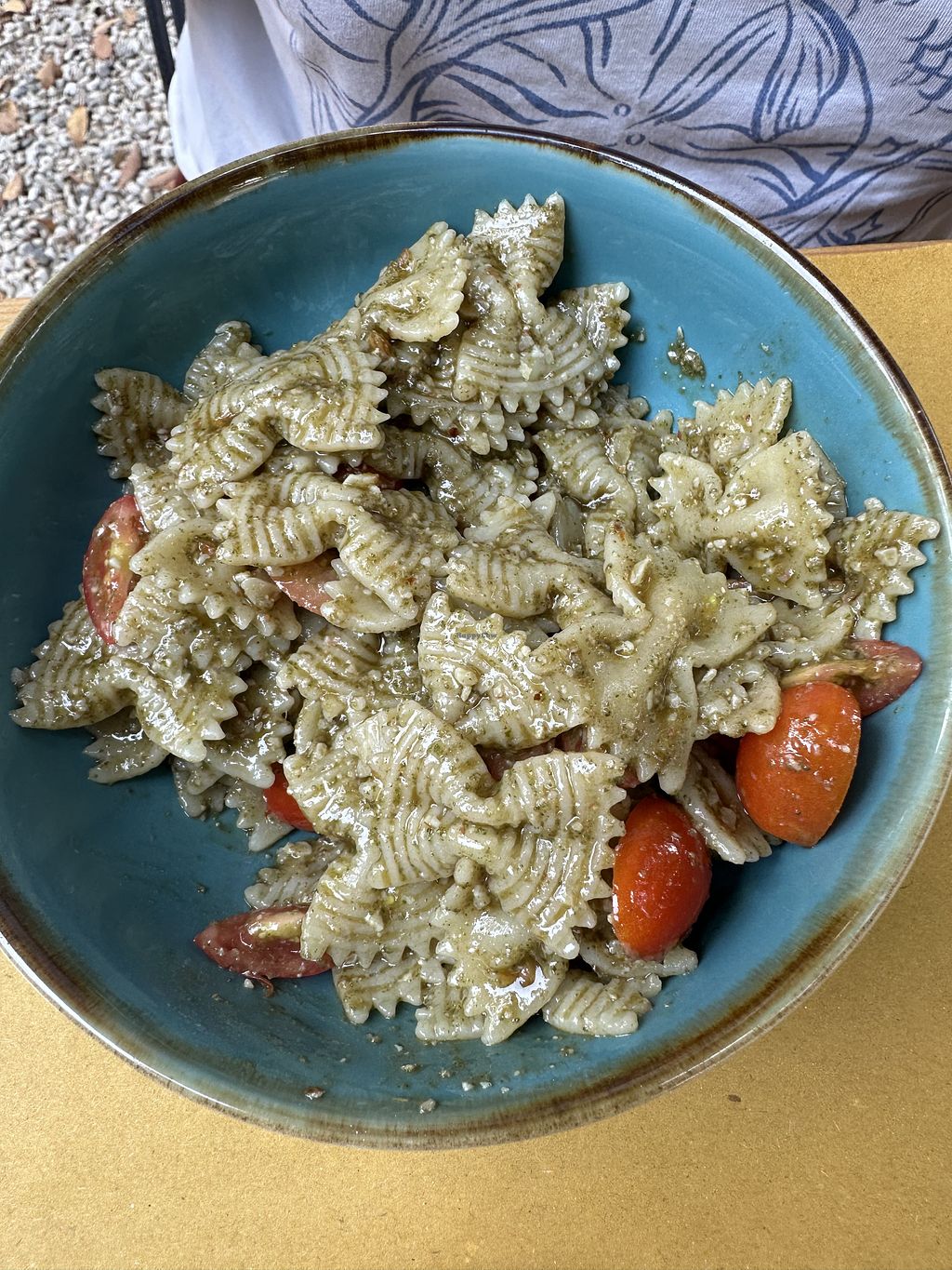 Le porzioni erano abbondanti, il cibo tutto buonissimo e fresco. Alcuni degli ingredienti (come la menta, la salva per il pesto ed altre verdure) venivano dall’orto del giardino.