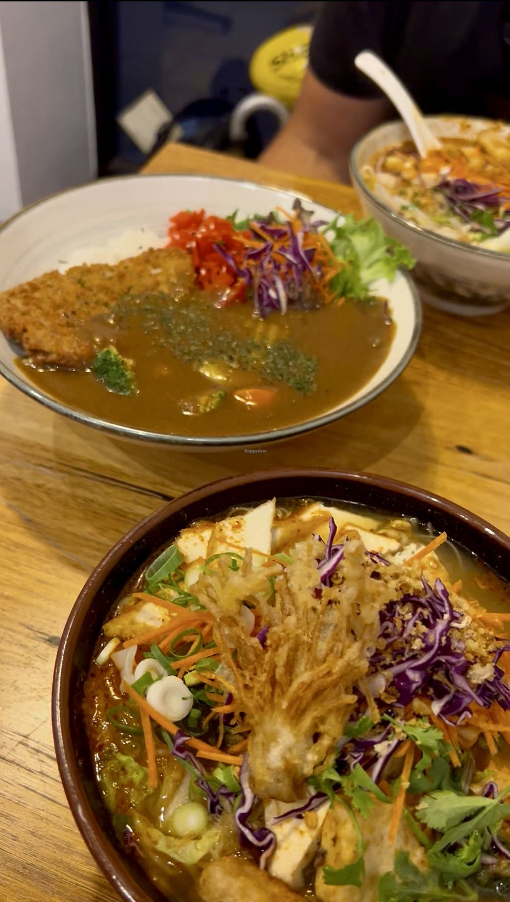 Wonderful food. We had spicy tofu poke bowl with soba noodles, vegan chicken katsu curry with rice and chickpea massaman curry with roti. So good.