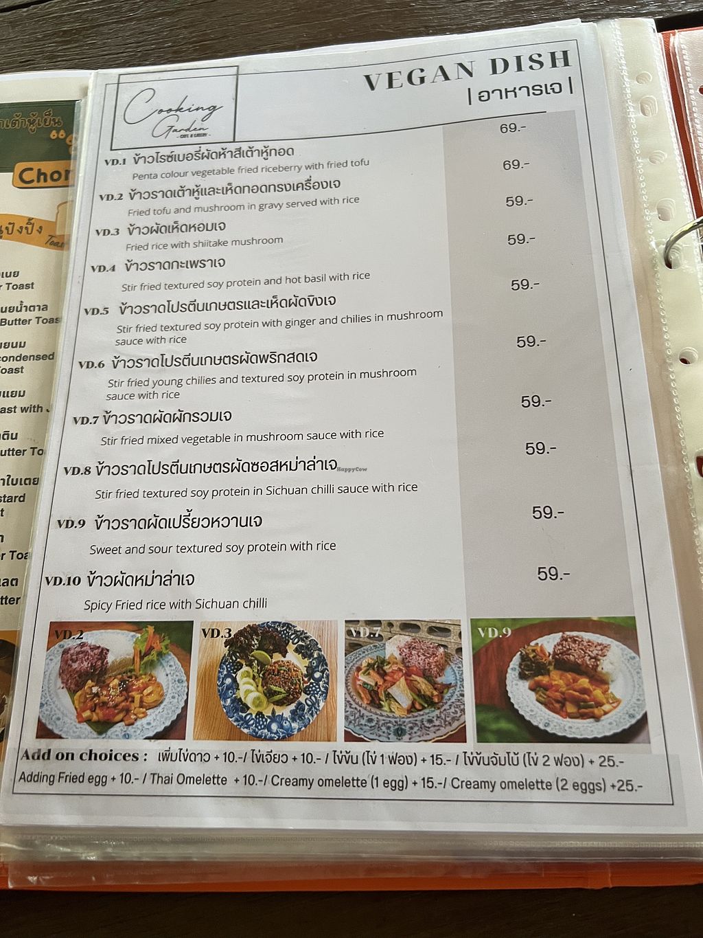 Serves meat, vegan options available. Has a full jey เจ (vegan) page in the menu and will happily adapt vegan dishes to be vegan on request. Example dishes include stir fries, fried rice and dishes with tofu/soy protein. The owners are reported to be vegan. Nestled between foothills and alleys, check the Facebook page for directions. Open Tue-Sun 8:00am-5:00pm. Closed Mon.
