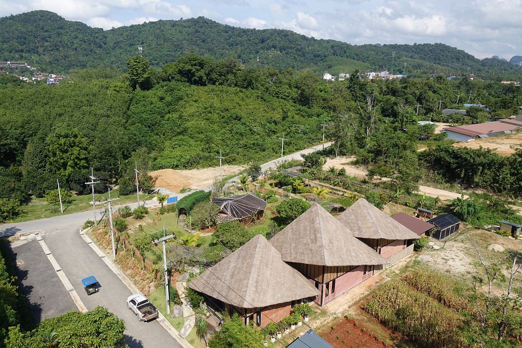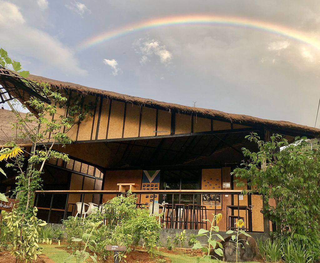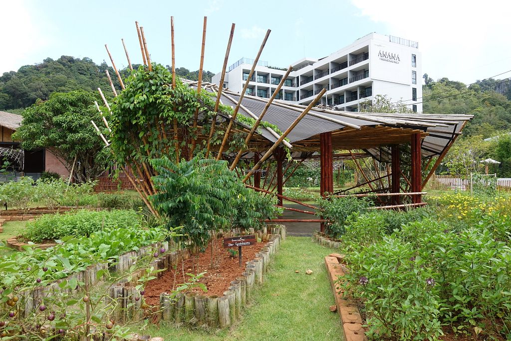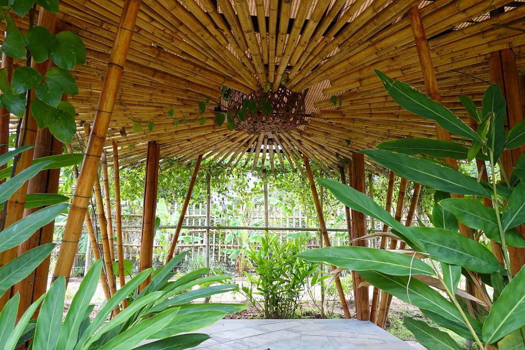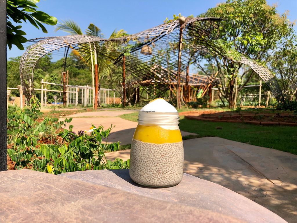 The beautiful garden, and the yoga shala right next to the restaurant