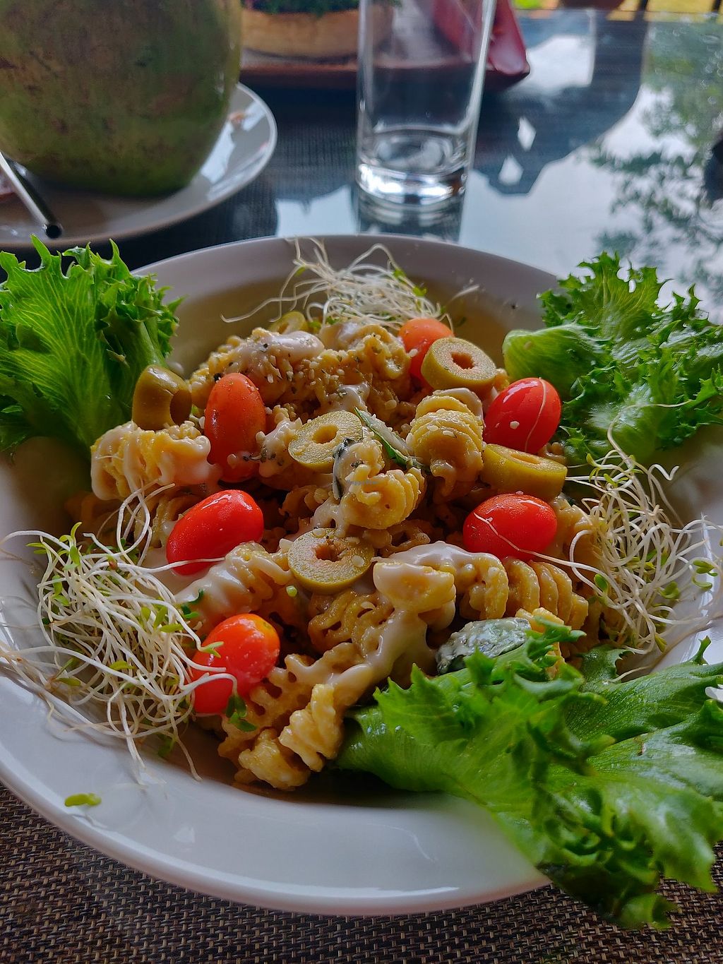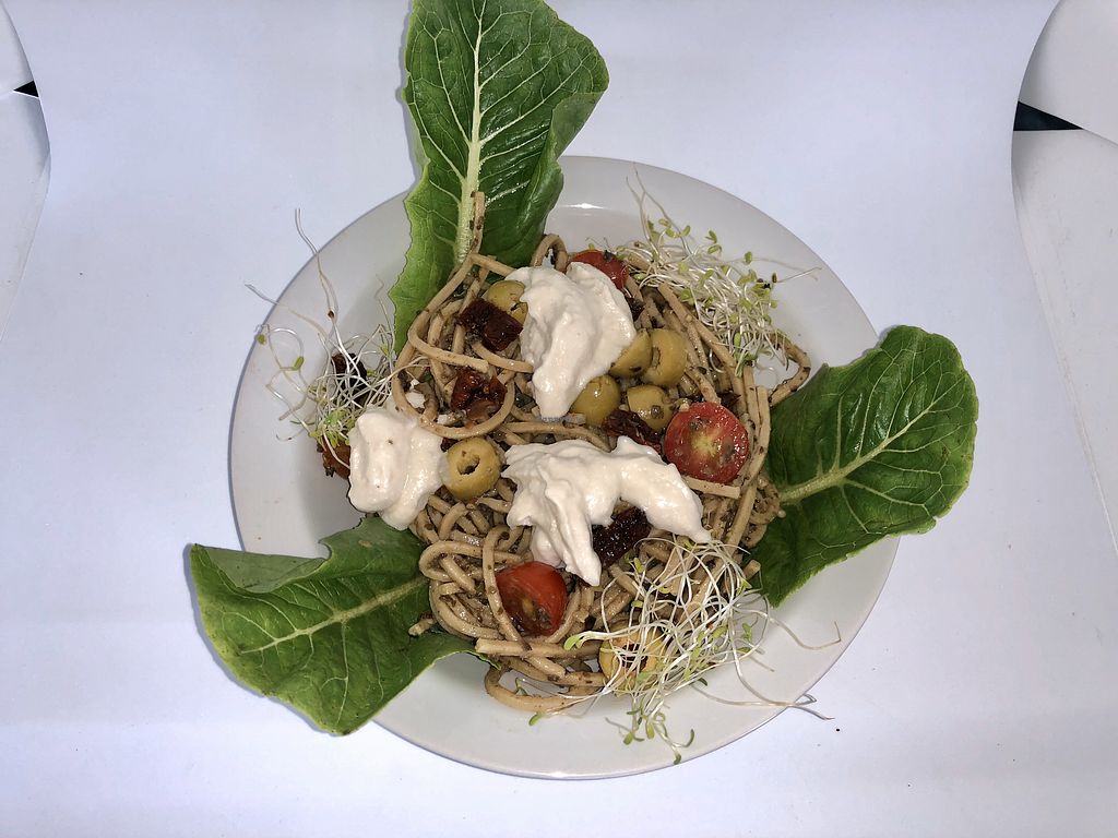 Pasta with tomatoes, olives, Italian basil and homemade cashew cheese