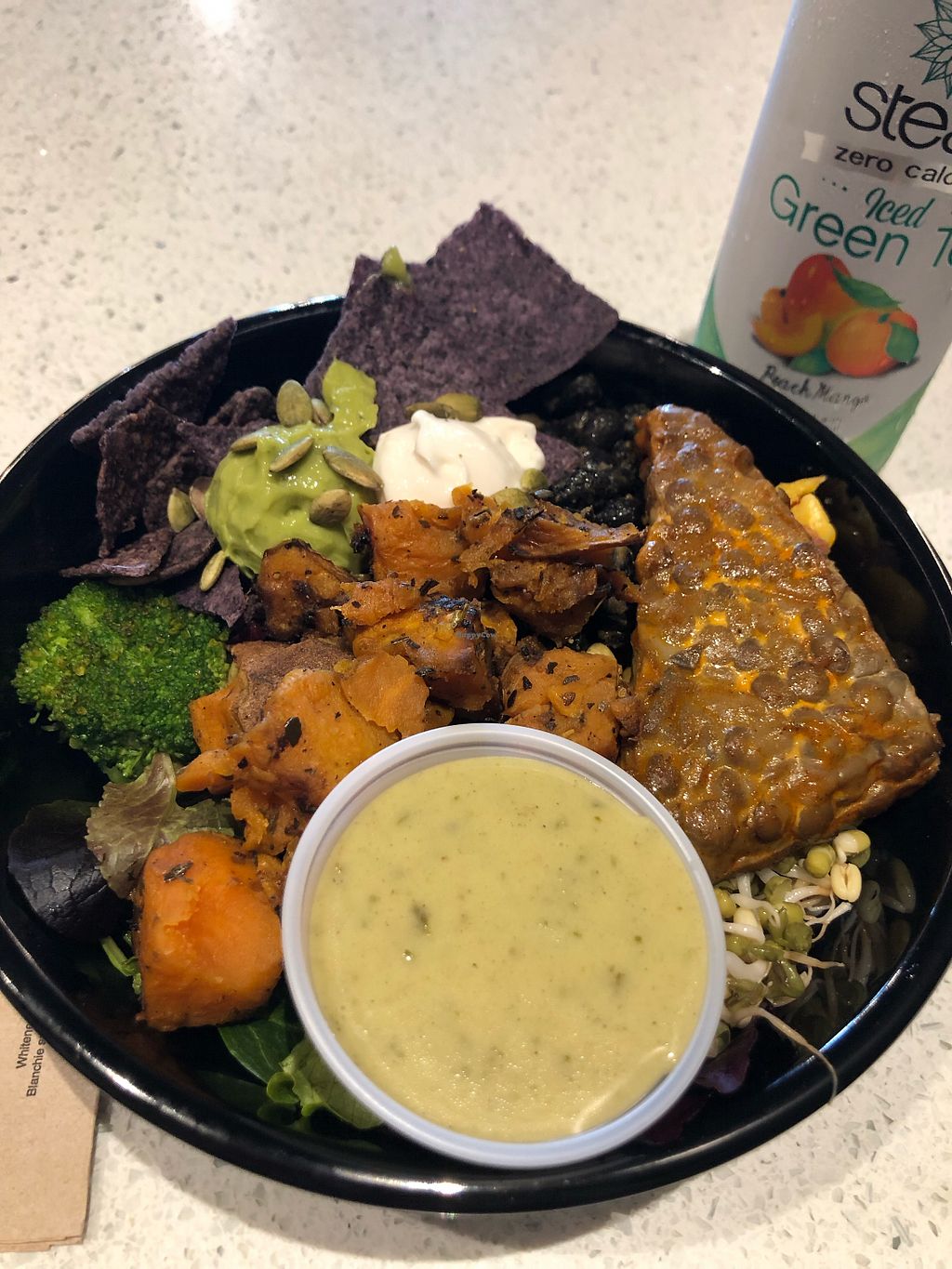 The food was great. I got the “mini” power bowl and it was too much to finish. And I’m a bigger vegan, haha. You can pick the base (I chose quinoa), and protein (tempeh).