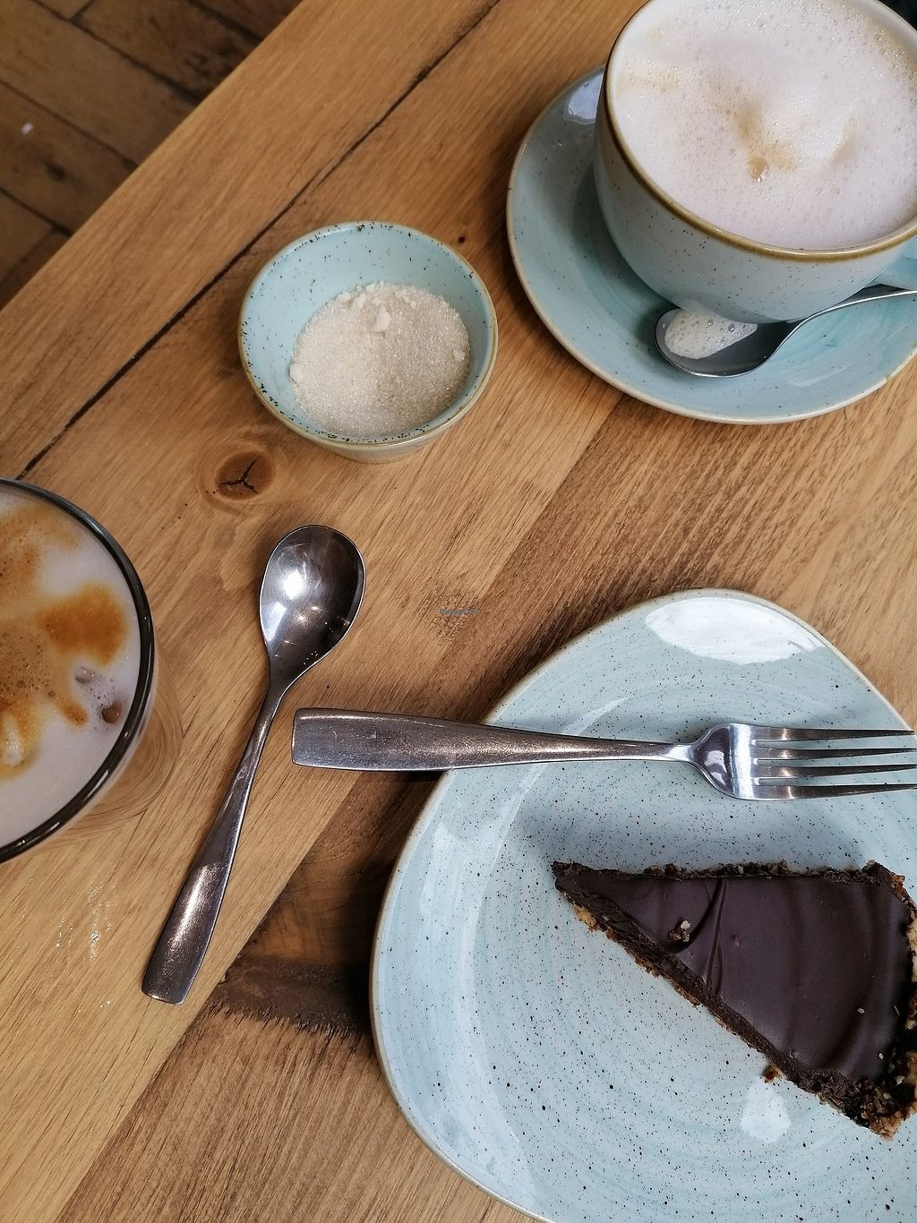 Ice oat milk latte, cappucchino and a chocolate tart