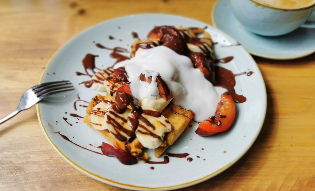 Waffles with dark chocolate sauce, banana, plums and coconut yogurt