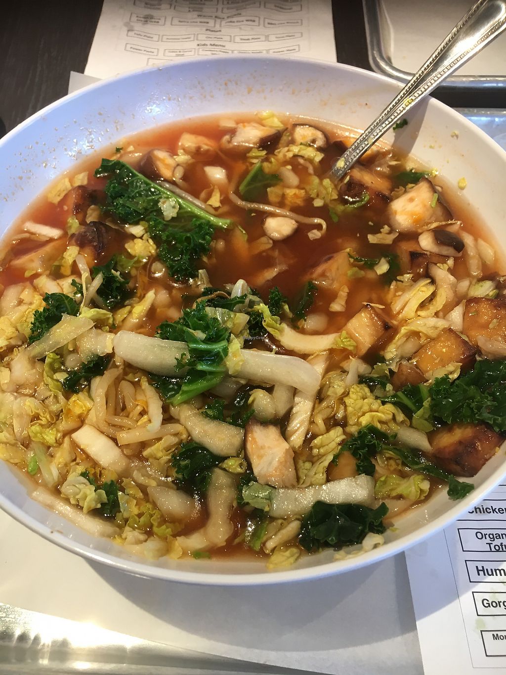 Lots of vegan options and fresh ingredients! You can make a salad or a broth based soup with fresh veggies. Vegan options are clearly labeled and staff is knowledgeable about ingredients found in different items. There is a print out of all the ingredients in each sauce and which ones are vegan friendly.