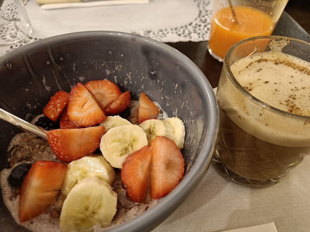 Pancakes with berries, banana and maple syrup + a coffee with warm soy…