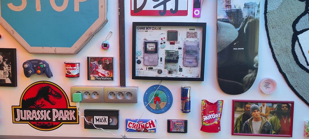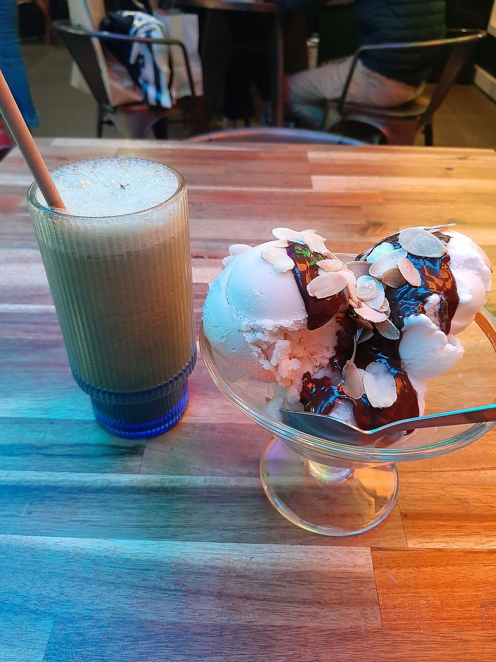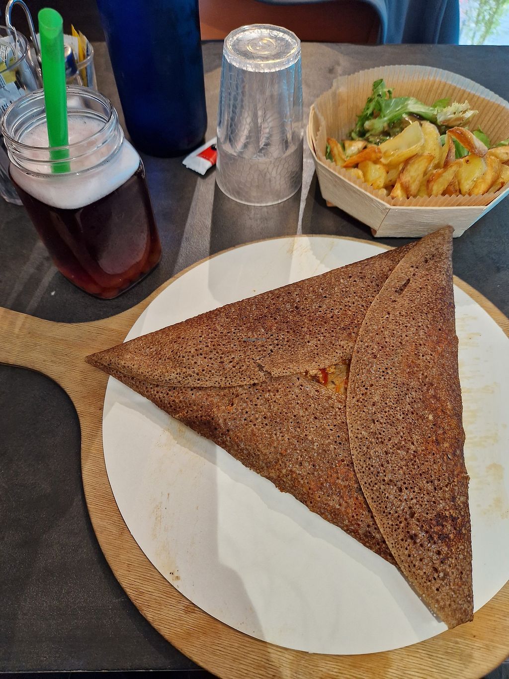 Vegan galette with salad and fries, and strawberry-passion fruit bubbl…