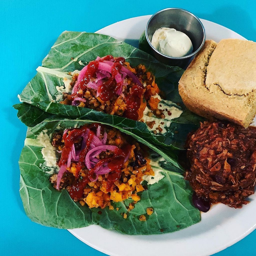 Raw Butternut Tacos with Jalapeño Cornbread, BBQ Jackfruit & Beans