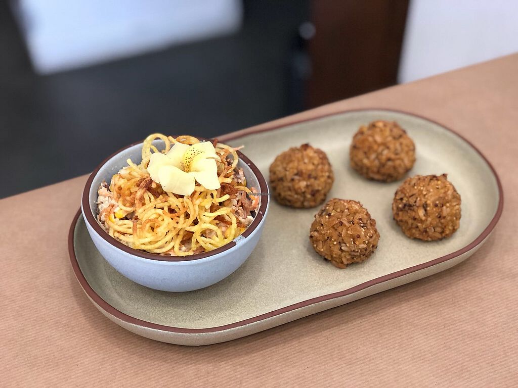 Day dish - vegetable salad w/ vegan mayonnaise and rice balls