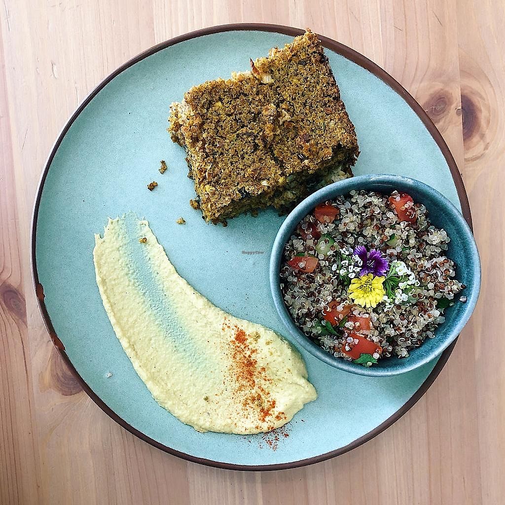 Mushroom and caramelized onions tart with couscous and tahini sauce