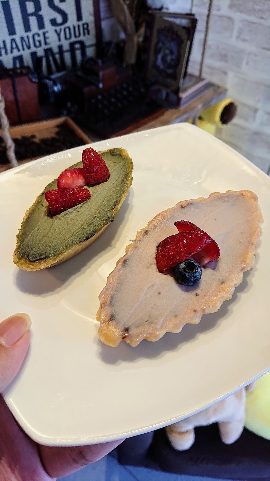 matcha cream tart, strawberry cream tart