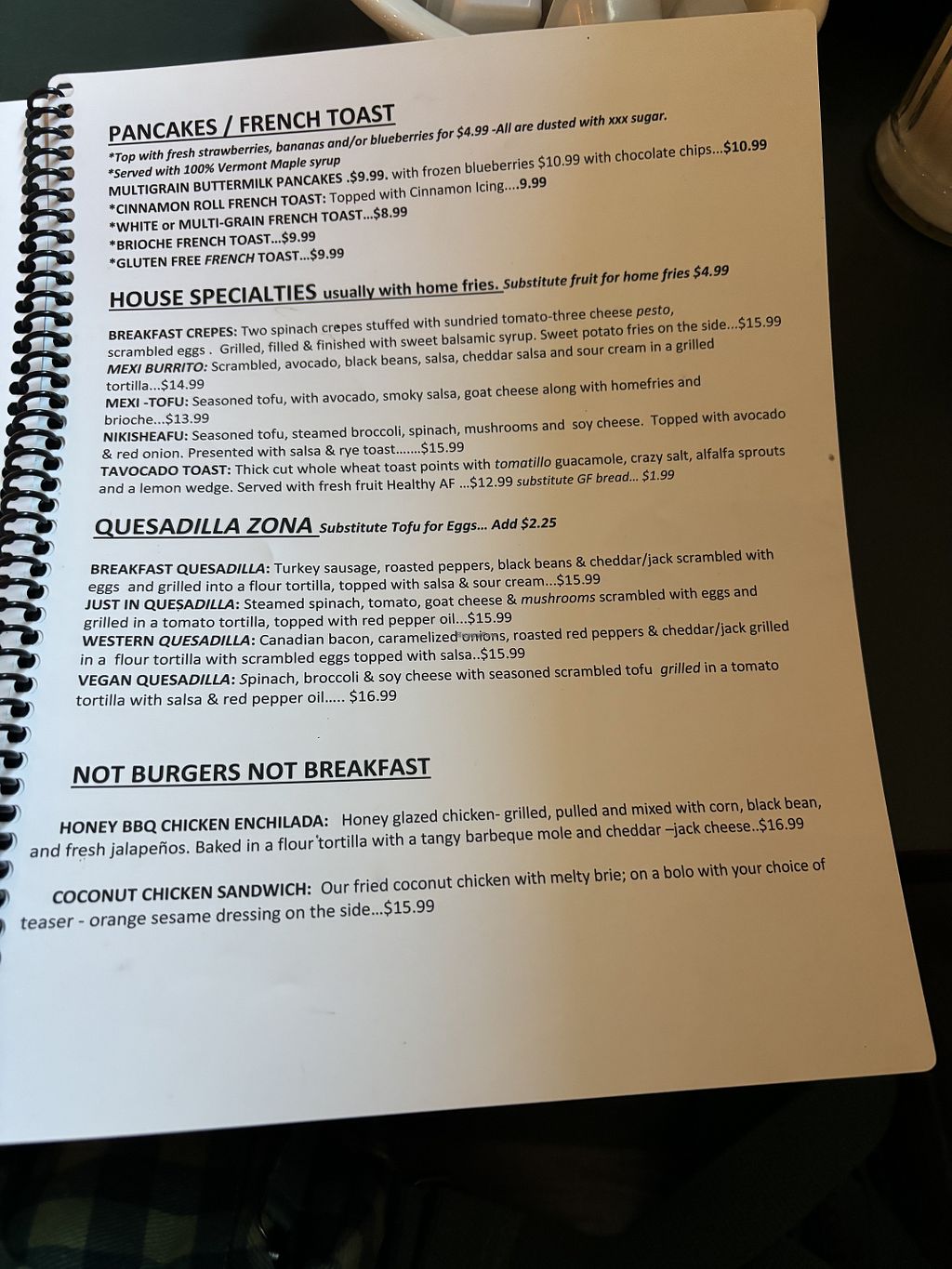 A group of us, not all vegan, got some food from there. I got a vegan “burger” (wrap) and it was good. Nothing amazing which was the general consensus. We decided to go back there for breakfast and let me tell you. I got the Mexi-tofu, swapping the goat cheese with their soy cheese, and. It. Was. Amazing! They have about 4-5 total vegan breakfast options but NO LONGER HAVE VEGAN PANCAKES OR FRENCH TOAST. Would come again for breakfast and consider dinner if I was in the area