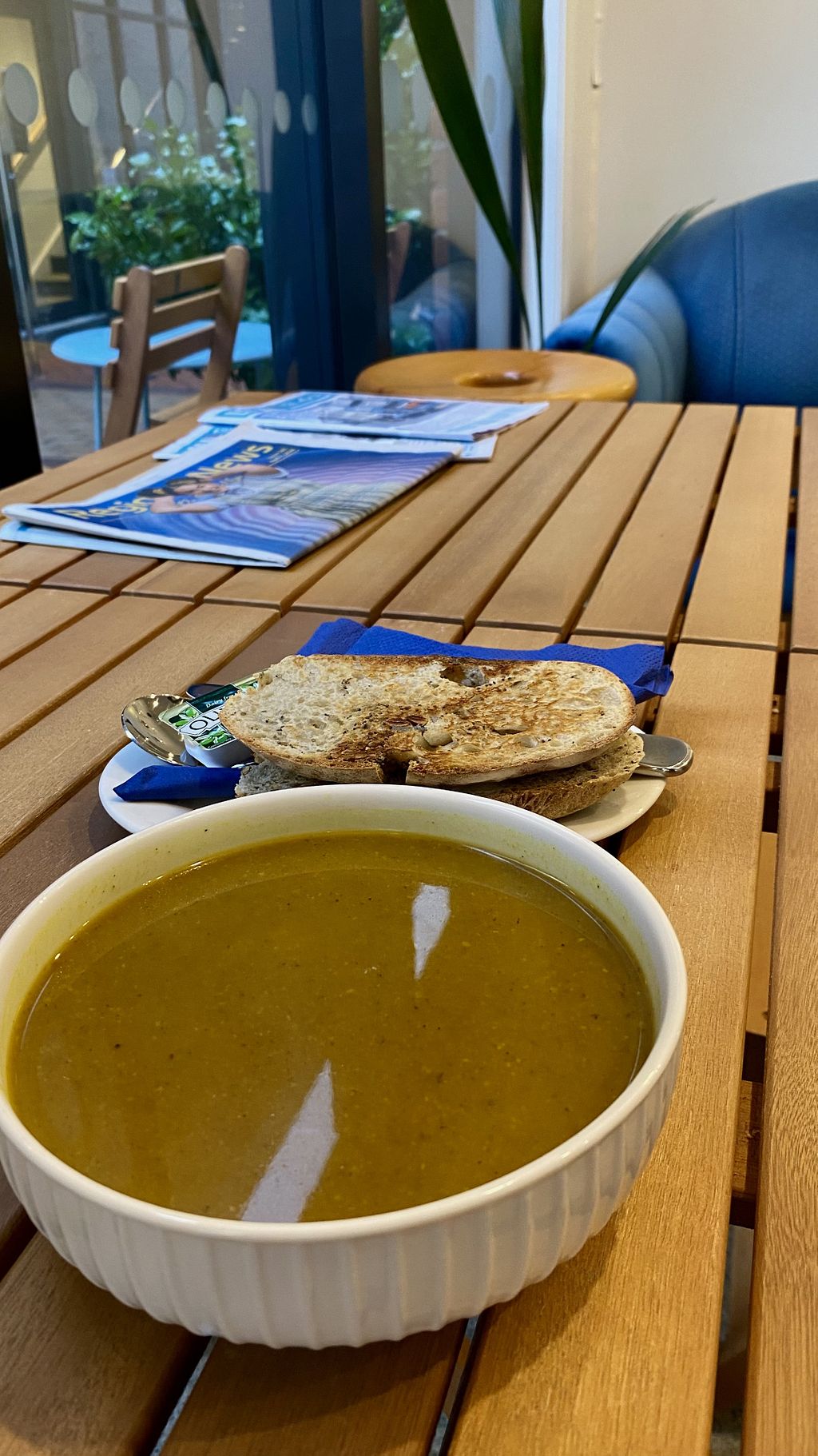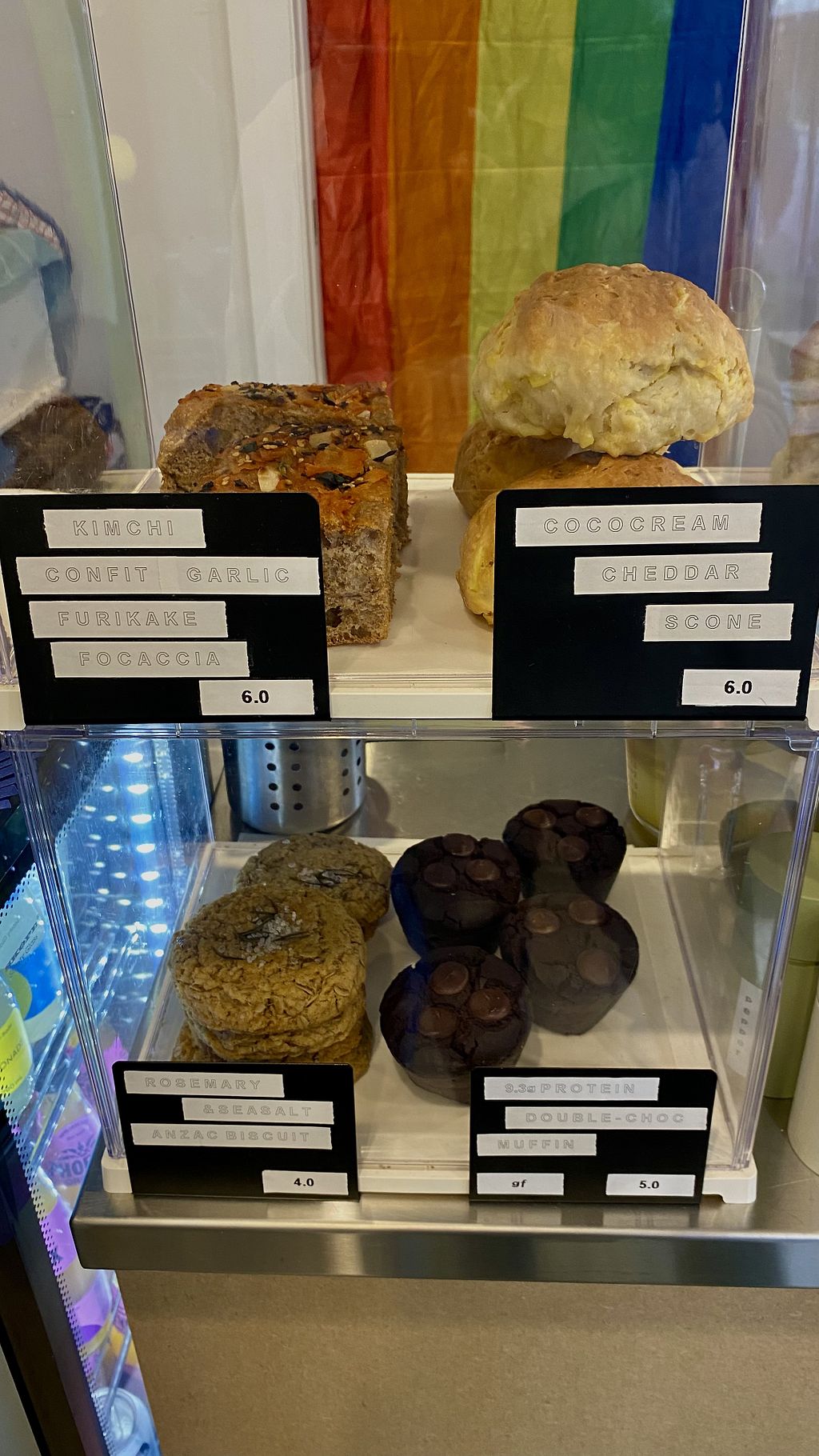 I went early in the morning for breakfast and they had golden soup with sourdough, and in the cabinet there were kimchi focaccia, scones, biscuits and muffins. The golden soup was amazing (made with turmeric, garlic, ginger, and mushrooms) and was served with seedy sourdough slices and vegan butter. It was perfect for a chilly morning. I also got the kimchi and furikake focaccia, which was very hearty and delicious. The cafe is so cute and cozy with very friendly staff and a community of regulars. Highly recommend stopping by!!