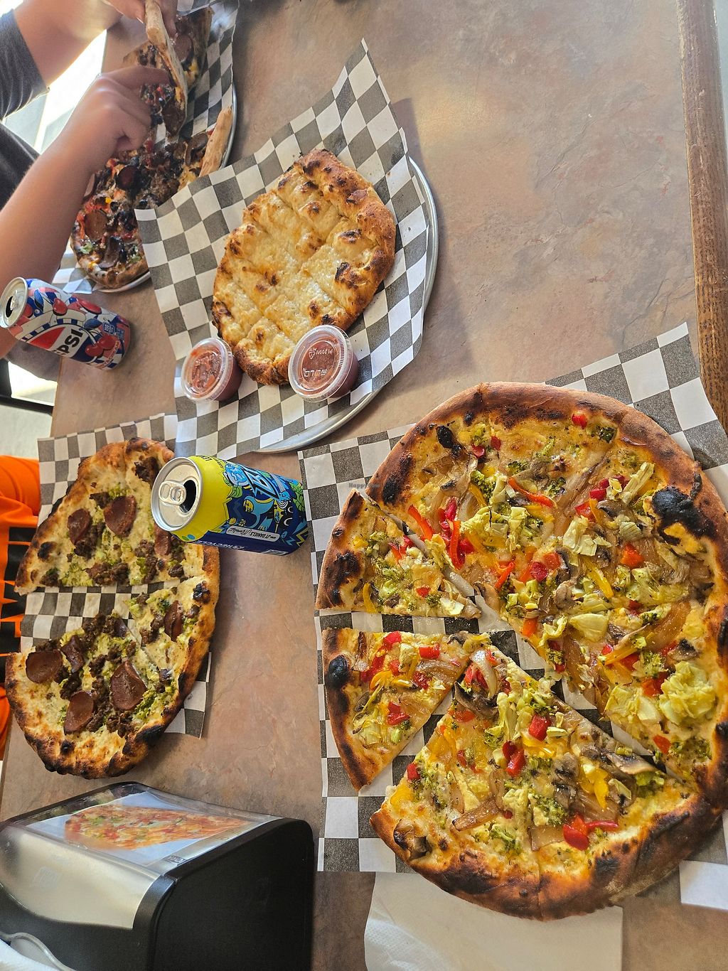 Vegan cauliflower crust, vegan ricotta, pesto, artichoke, vegan meatba…