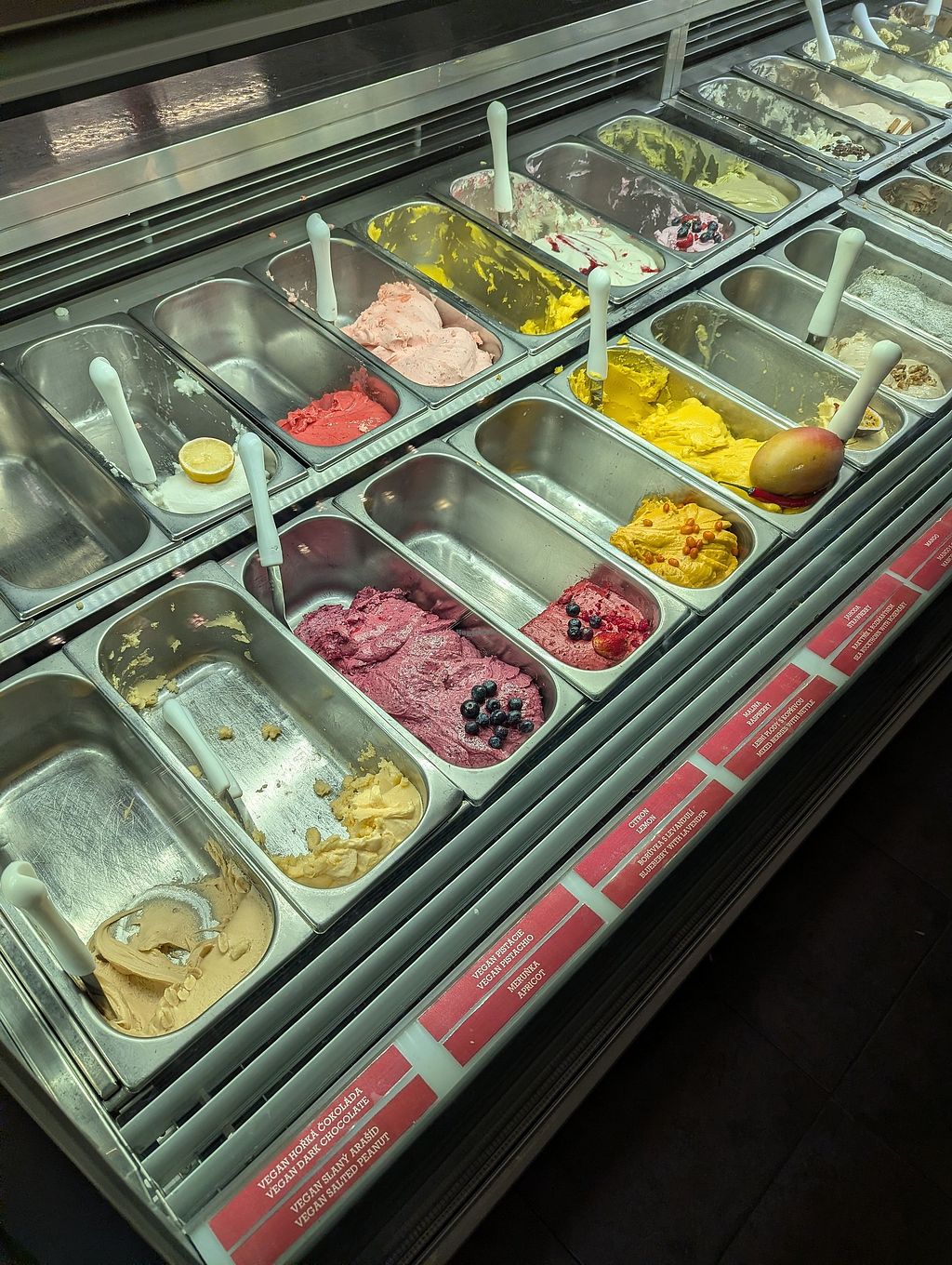This is the best vegan ice cream ive ever had, i could eat it all day and i wish i had the chance. everybody loved it, including my non vegan friends, who didn’t know they were ordering vegan. Granted, not everything is vegan here, i would say half the options are, but there are truly a lot of options with unique flavours, incluing “milk” based. Wish i had had more time in prague to come back here!! Red labels are the vegan ones. They let you choose as many flavours as you want in the cup, as long as it fits. I remember the salted caramel being delicious!