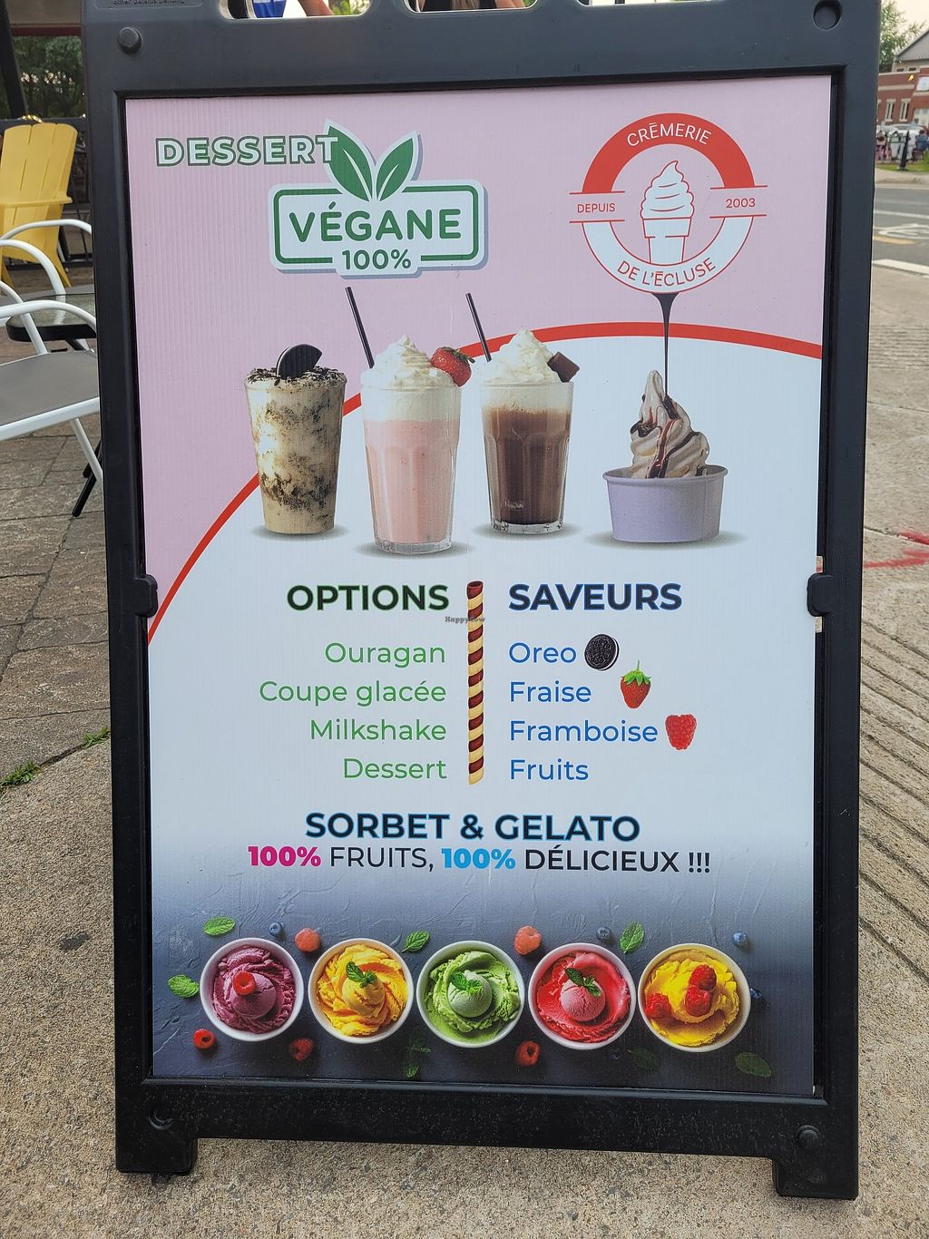 Menu à l'entrée qui indique les différentes options véganes. Ils utilisent crème glacée dure à la vanille pour fabriquer les différentes options de dessert.