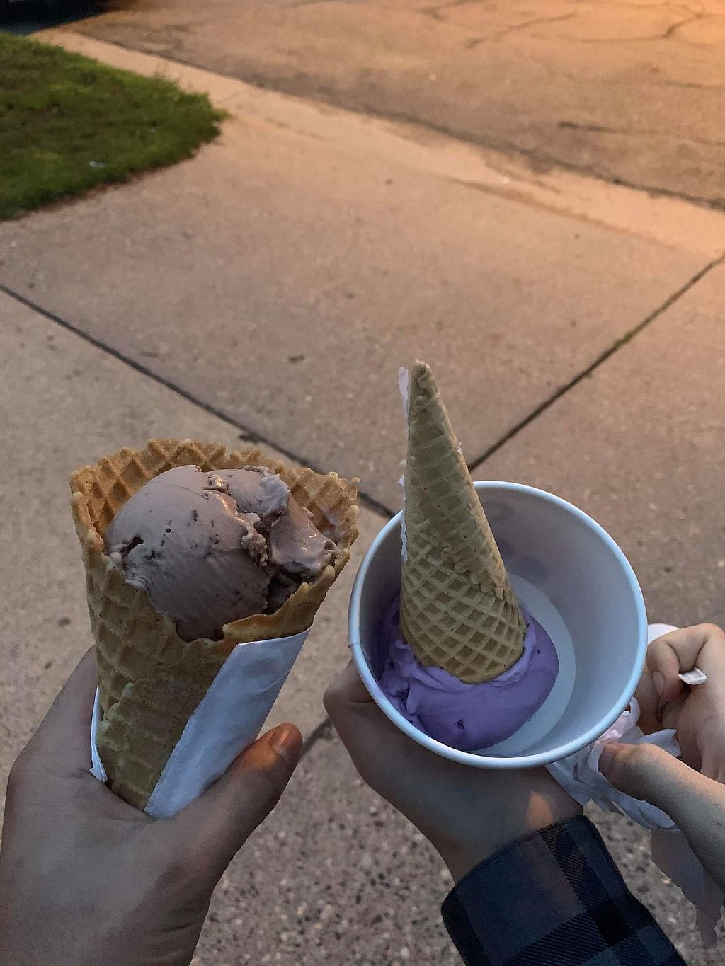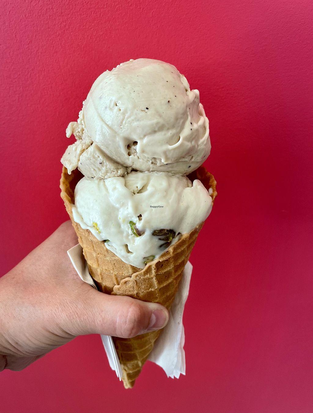Coffee + pistachio double scoop in a waffle cone