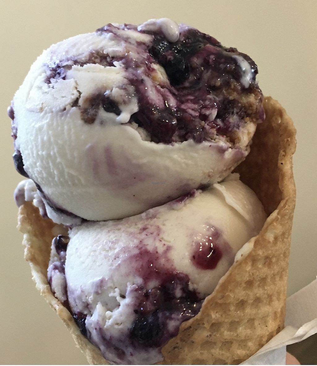 Two scoops of blueberry cheesecake ice cream in a waffle cone🫐💕