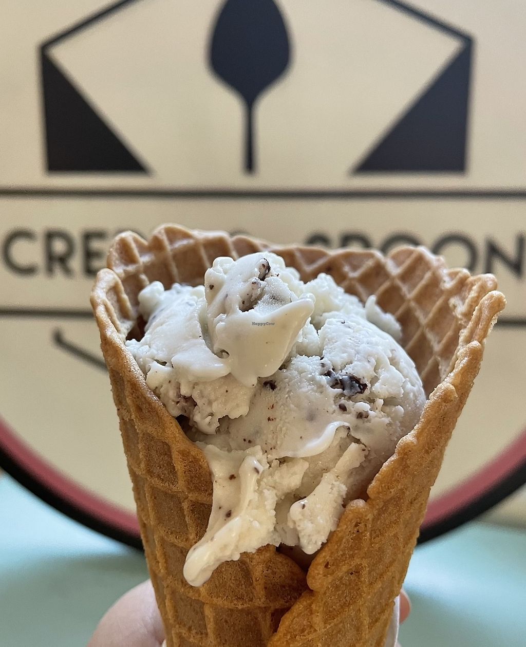 One scoop of Mint Chip in a waffle cone.