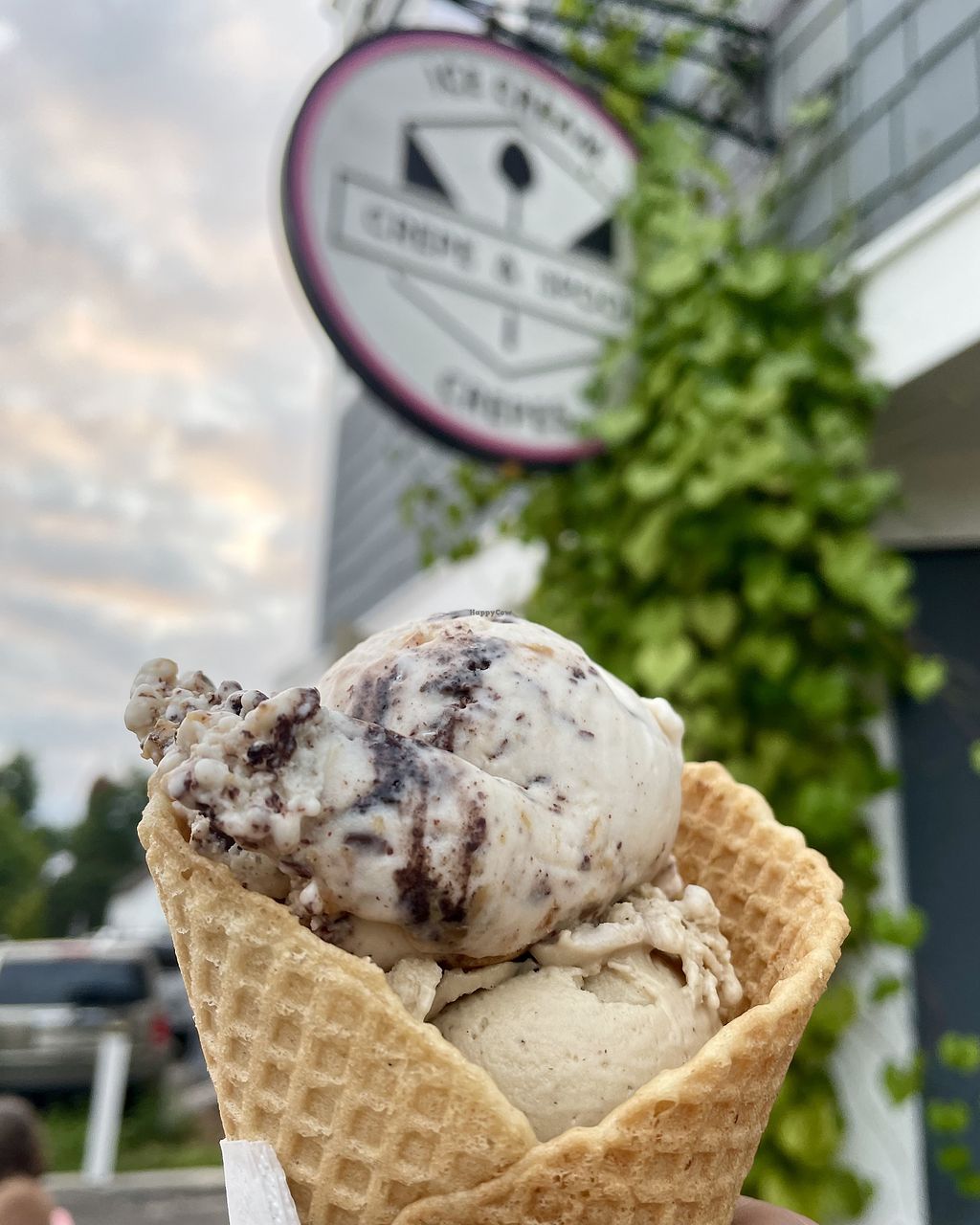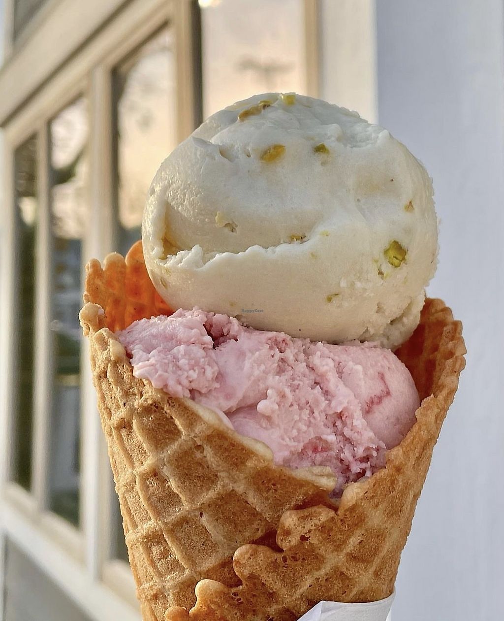 Two scoops in a waffle cone with pistachio and cherry chocolate flavor…