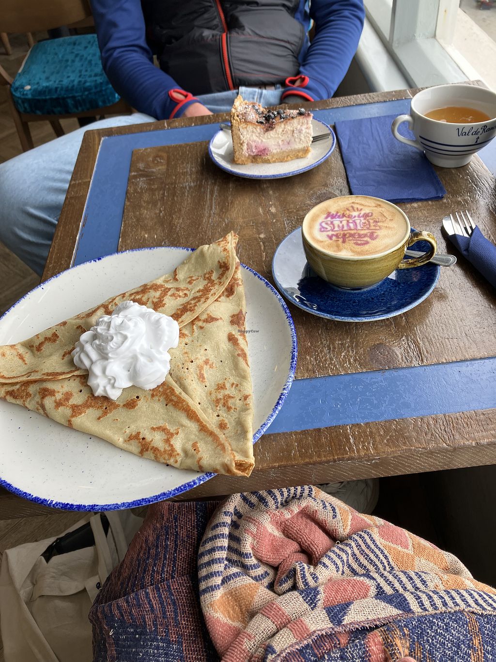 The food was great and quite a few vegan options. We had a savoury crepe with vegan cheese, meats and a variety of veg and a sweet crepe with ice cream and cream, which were both delicious. Has oat and soya milk and a range of vegan cakes and one vegan coissant. Lovely views and good service.