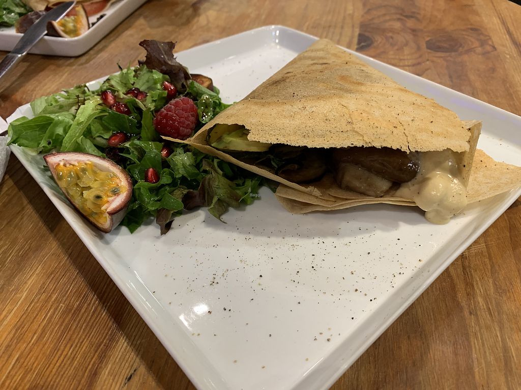 Vegan Mozzarella cheese, mushrooms, spinach and red beet hummus. 🌱🥬🧆🥙