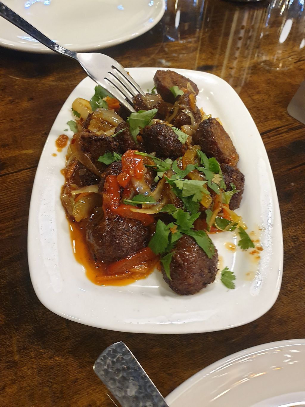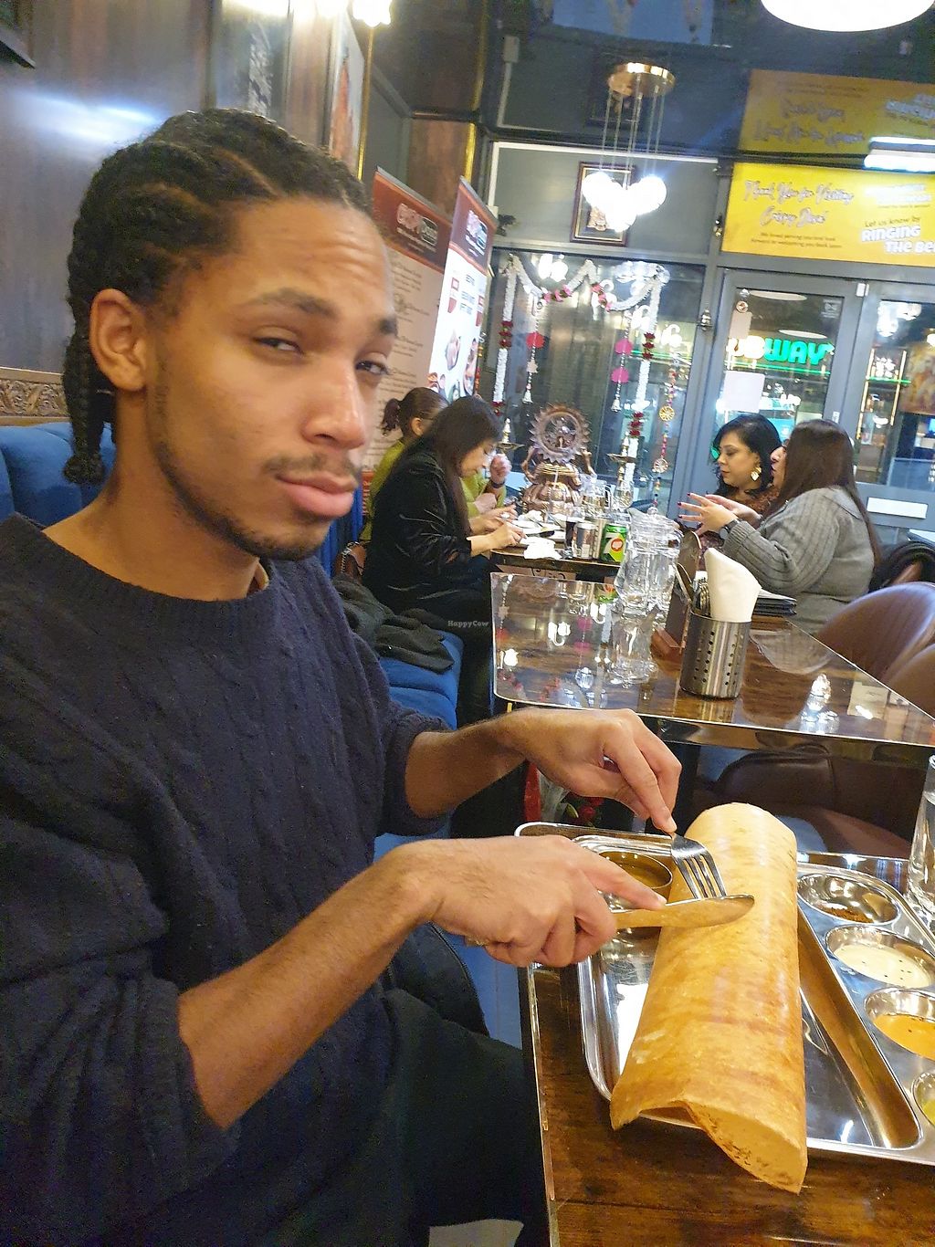 Serves meat, vegan options available. Restaurant offering clearly vegan and veganizable dishes like plain dosa, masala dosa, and mushroom Manchurian dosa, served with coconut chutney and sambar. Open Mon-Sun 11:00-22:30.