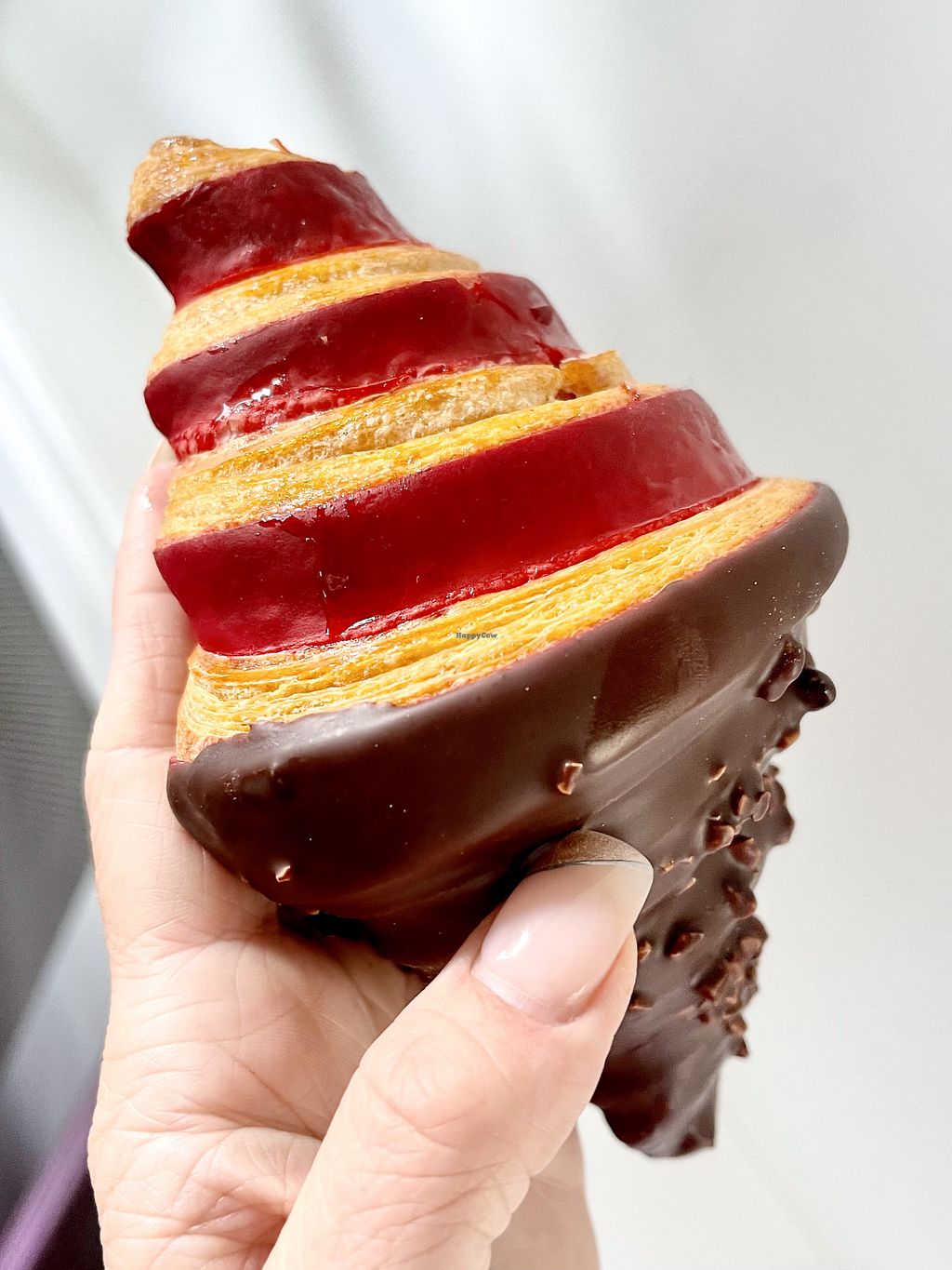 Croissant cafe with two sweet and one savory vegan options: chocolate raspberry & apple crumble and aubergine, courgette & sundried tomato. Reported closed February 2023.